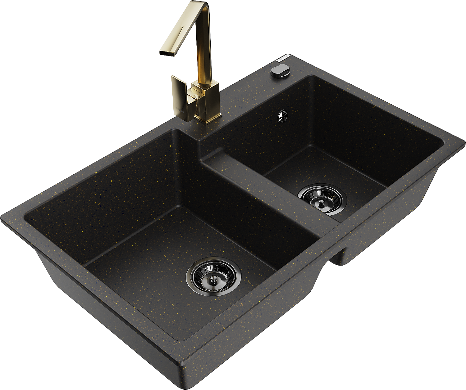 Mexen Tomas évier en granit 2 bacs avec robinet de cuisine Rita, noir/doré métallisé - 6516-75-670300-50-B