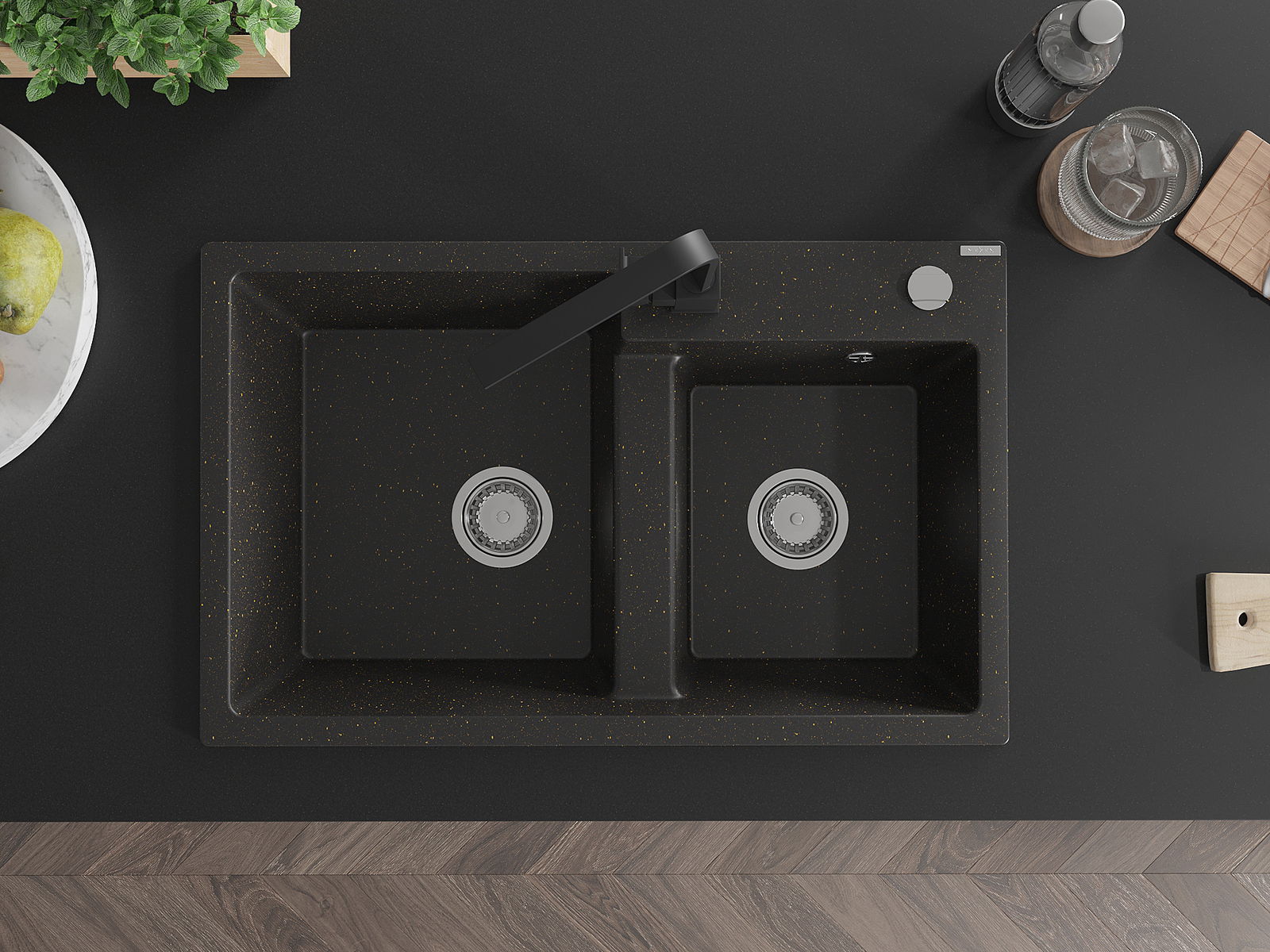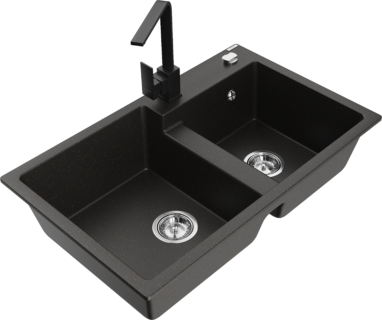 Mexen Tomas évier de cuisine en granit à 2 bacs avec robinet Rita, noir/or métallique - 6516-75-670300-70