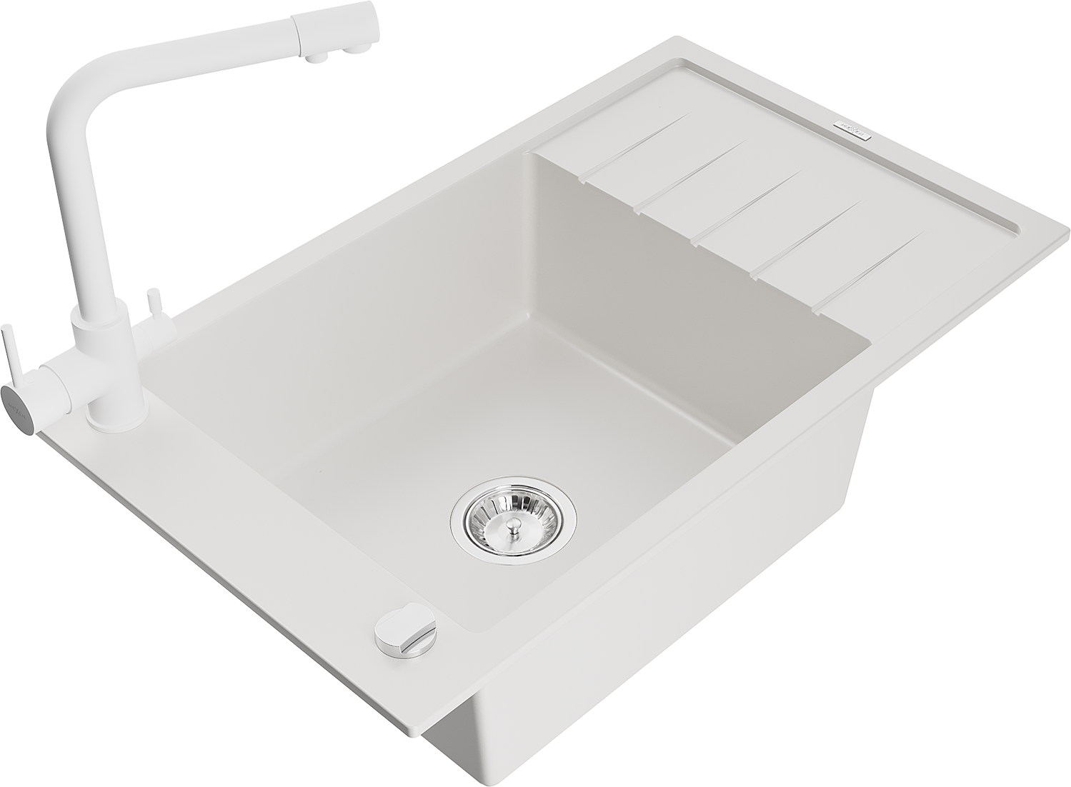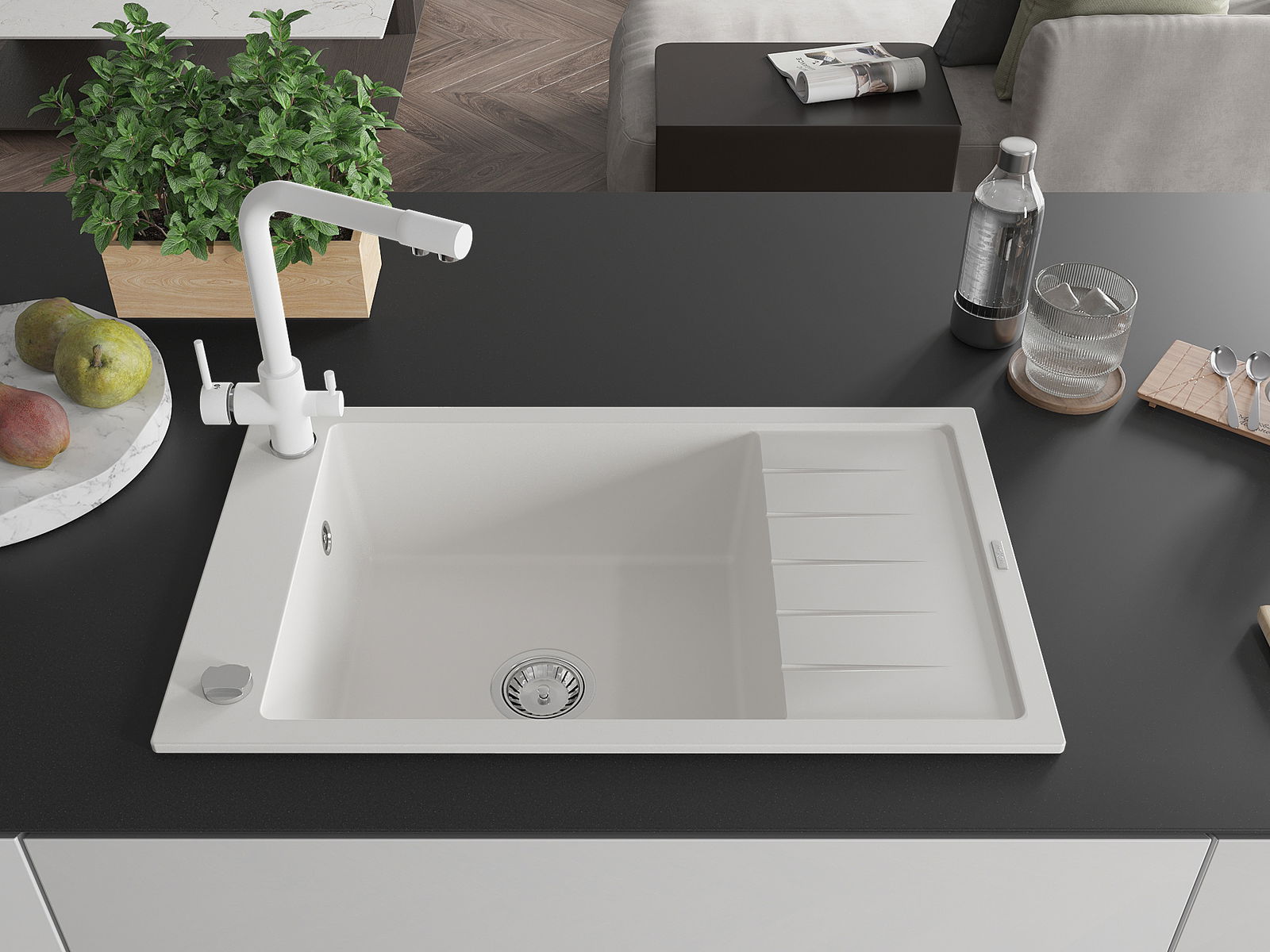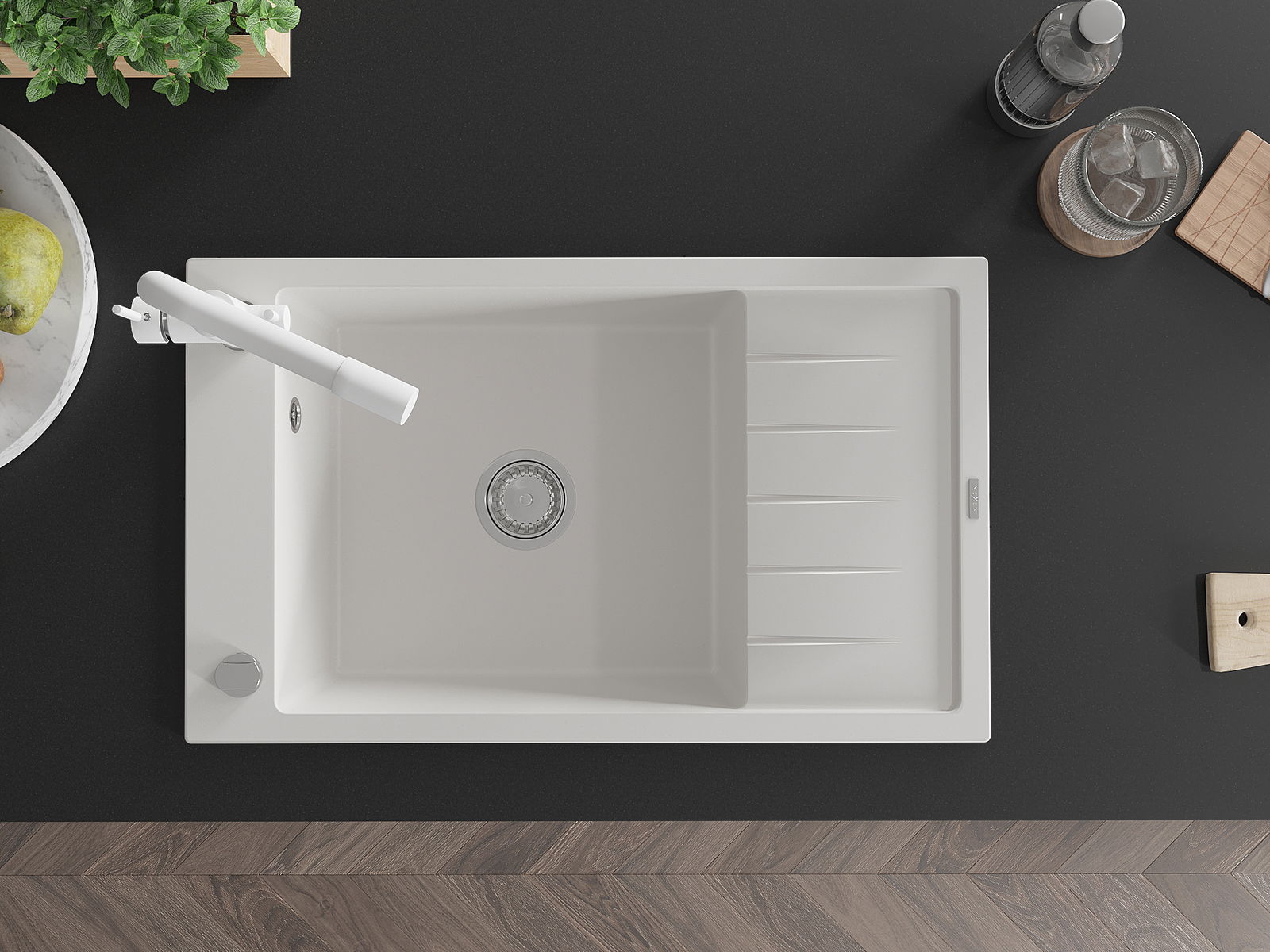 Mexen Elias évier de cuisine en granit 1 bac avec drain et robinet de cuisine Duero, blanc - 6511-20-671600-20