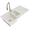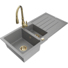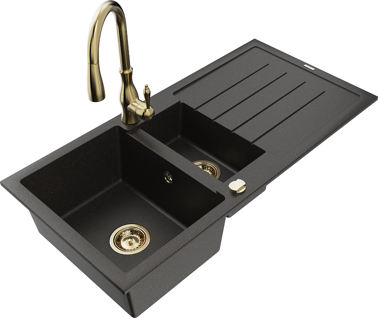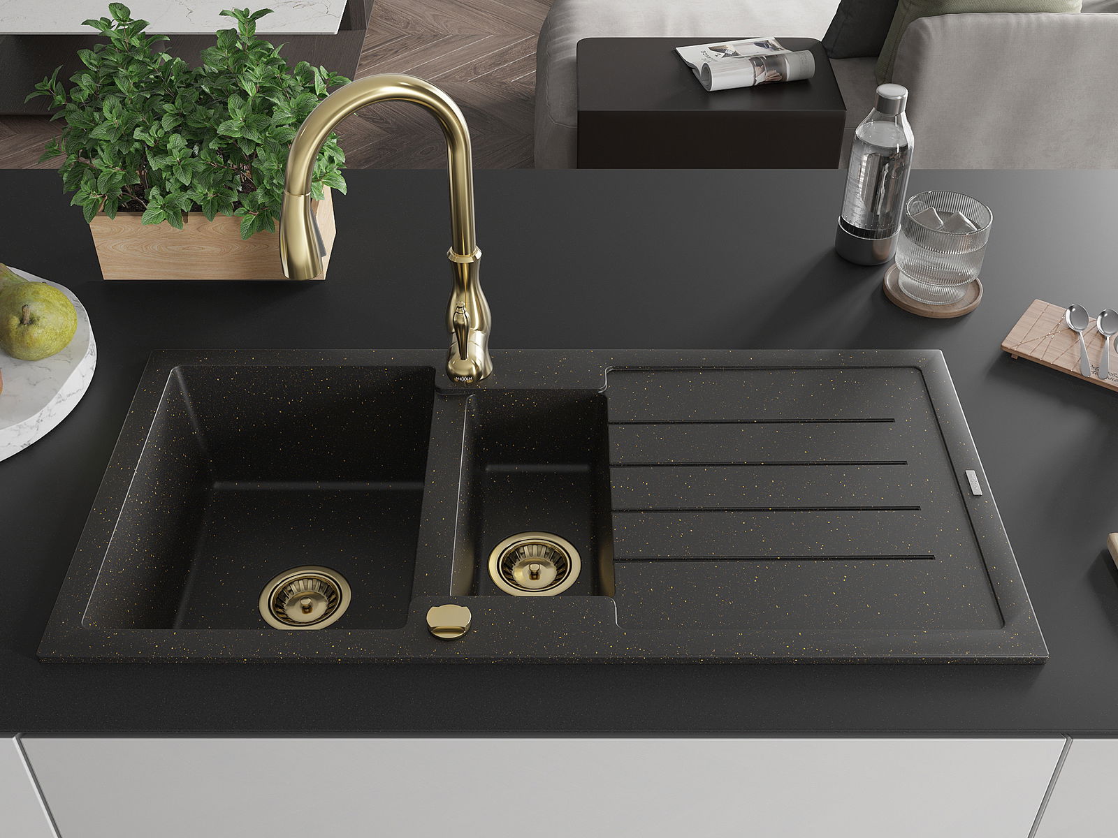 Mexen Andres évier en granit à 1,5 bac avec égouttoir et mitigeur de cuisine Savita, noir/doré métallisé