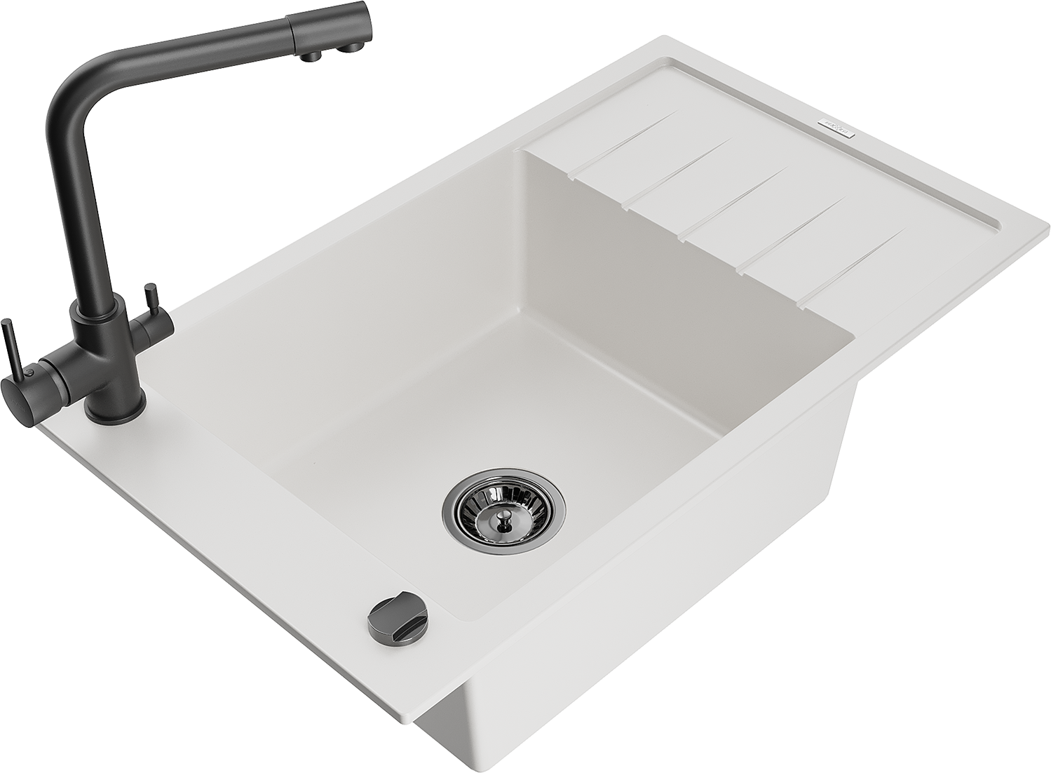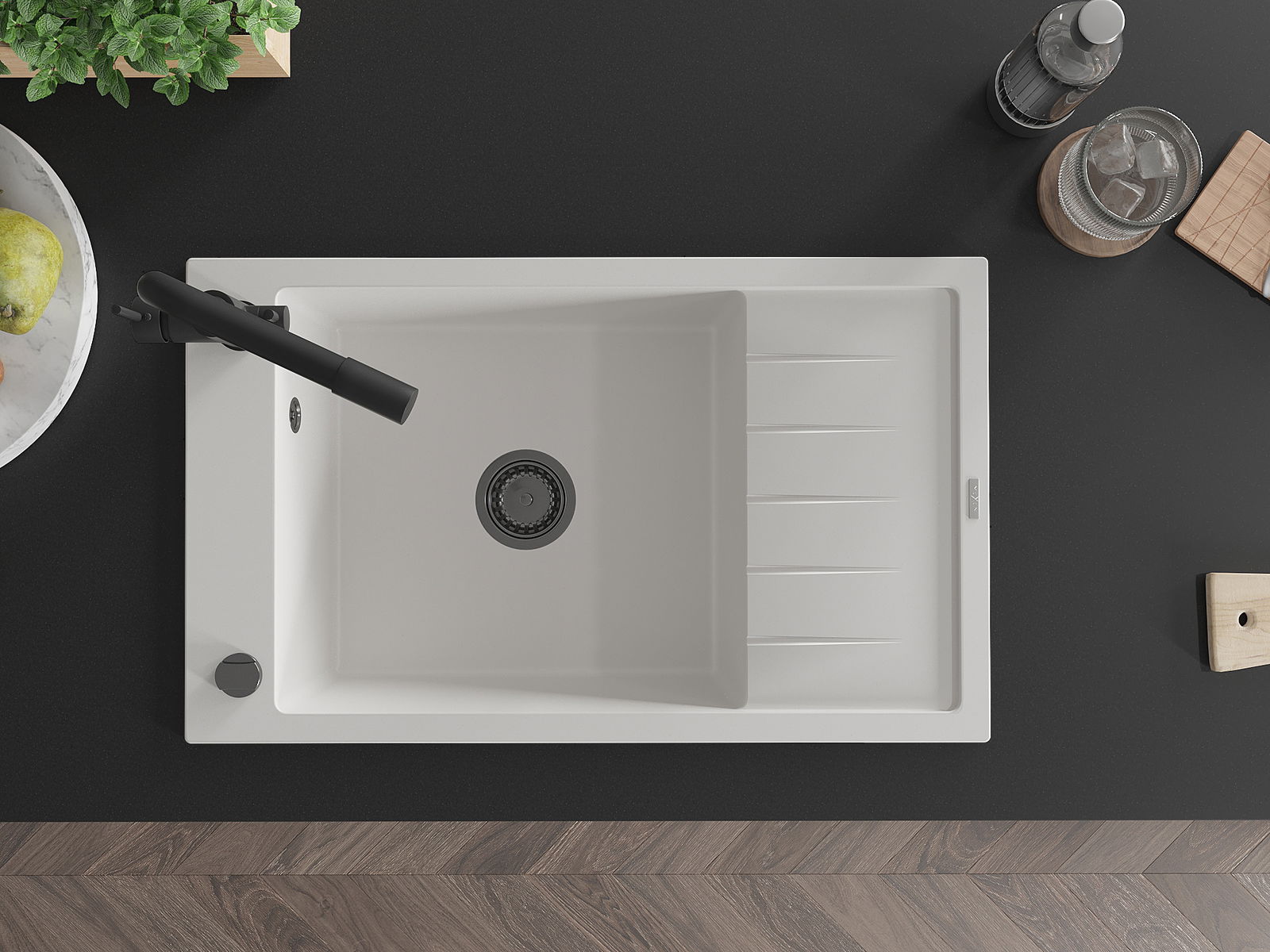Mexen Elias évier en granit 1 bac avec égouttoir et mitigeur de cuisine Duero, blanc - 6511-20-671600-70