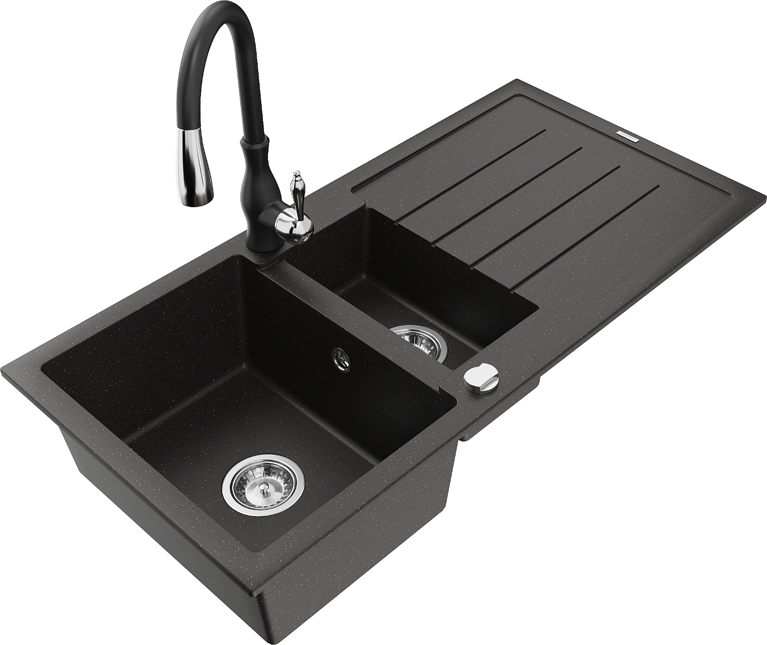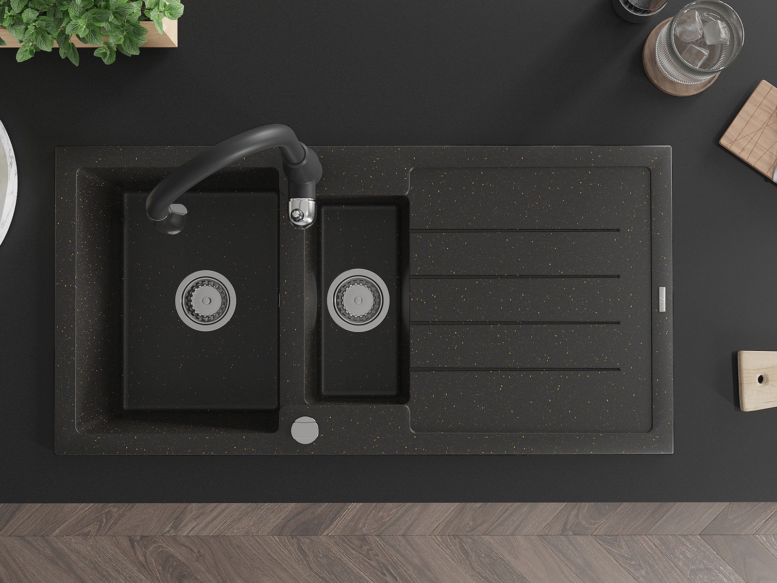 Mexen Andres évier en granit 1,5 bac avec égouttoir et robinet de cuisine Savita, noir/or métallique - 6515-75-672601-70