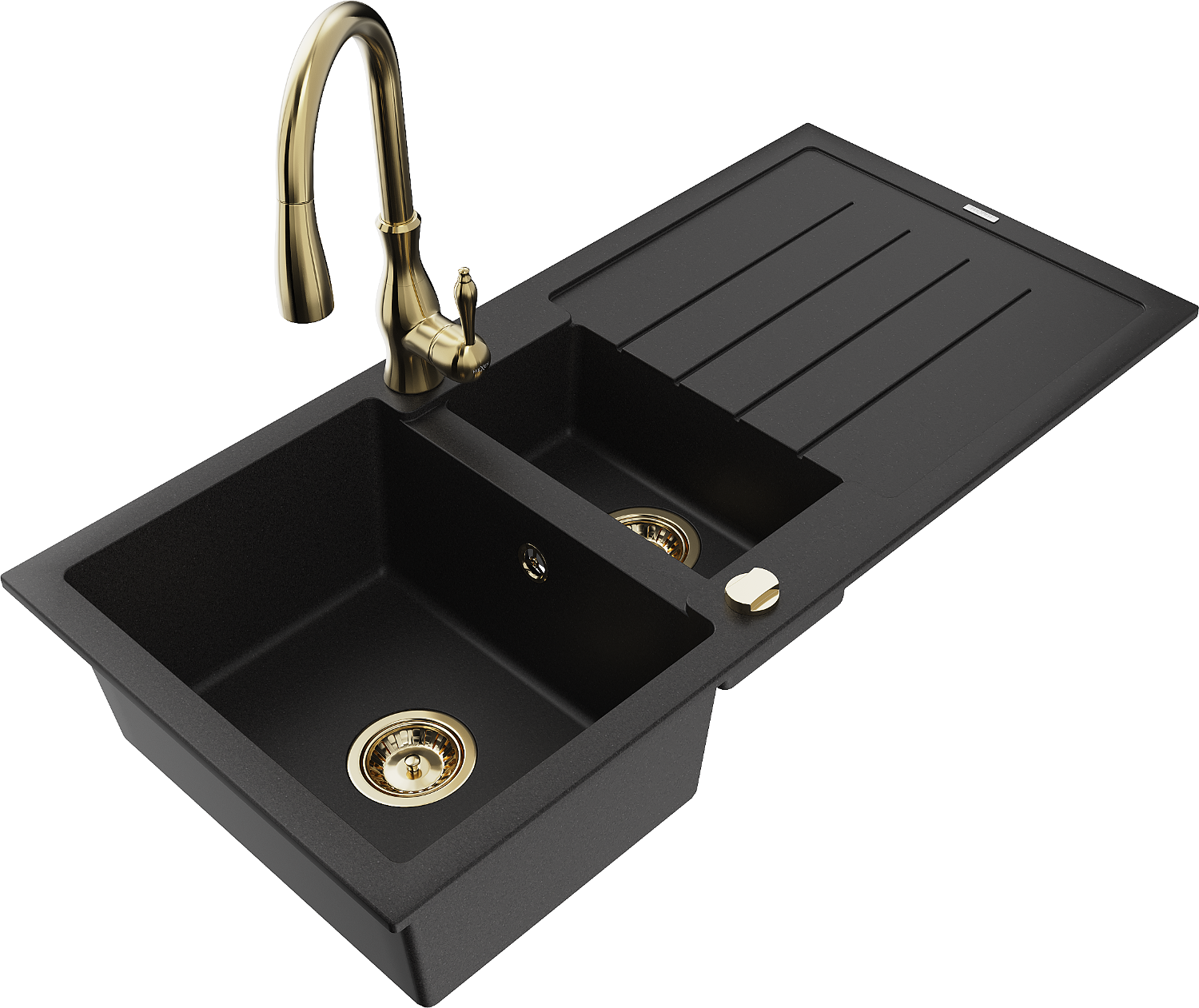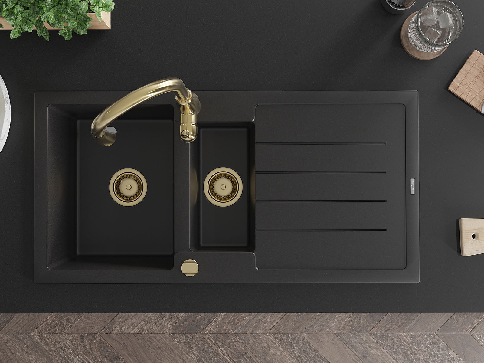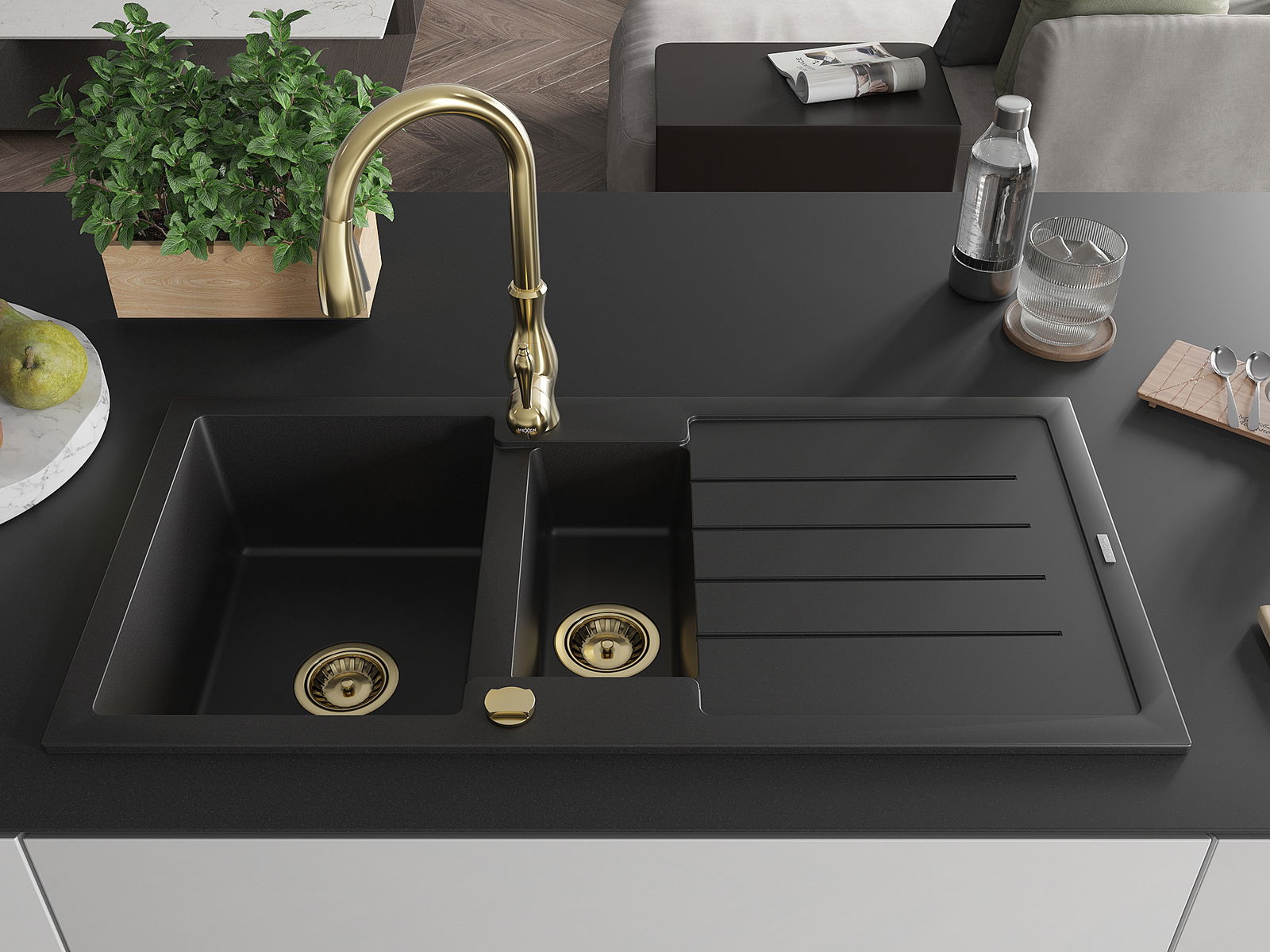 Mexen Andres évier en granit 1,5 bac avec égouttoir et robinet de cuisine Savita, noir - 6515-77-672601-50