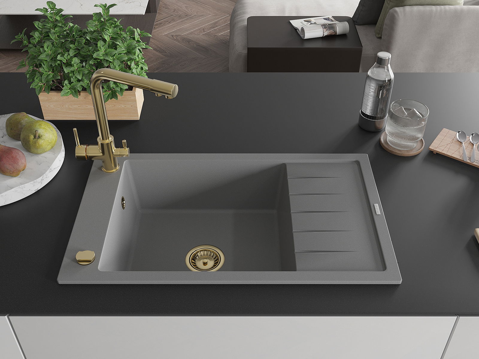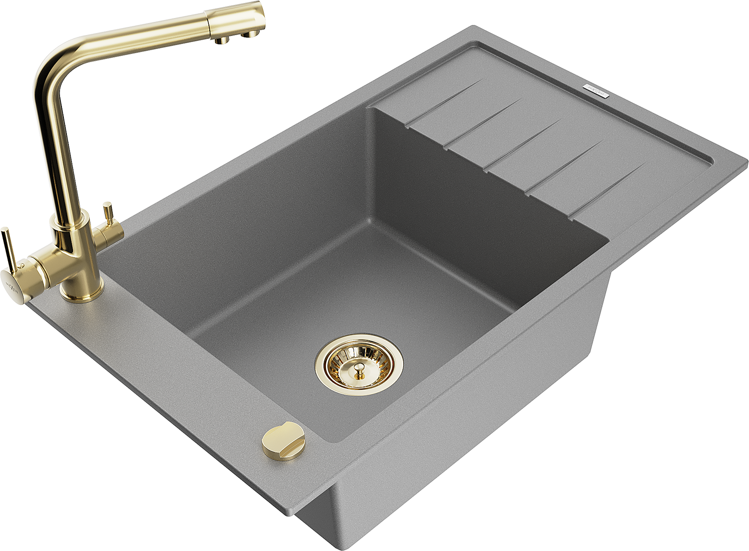 Mexen Elias évier en granit à 1 bac avec égouttoir et robinet de cuisine Duero, gris - 6511-71-671600-50