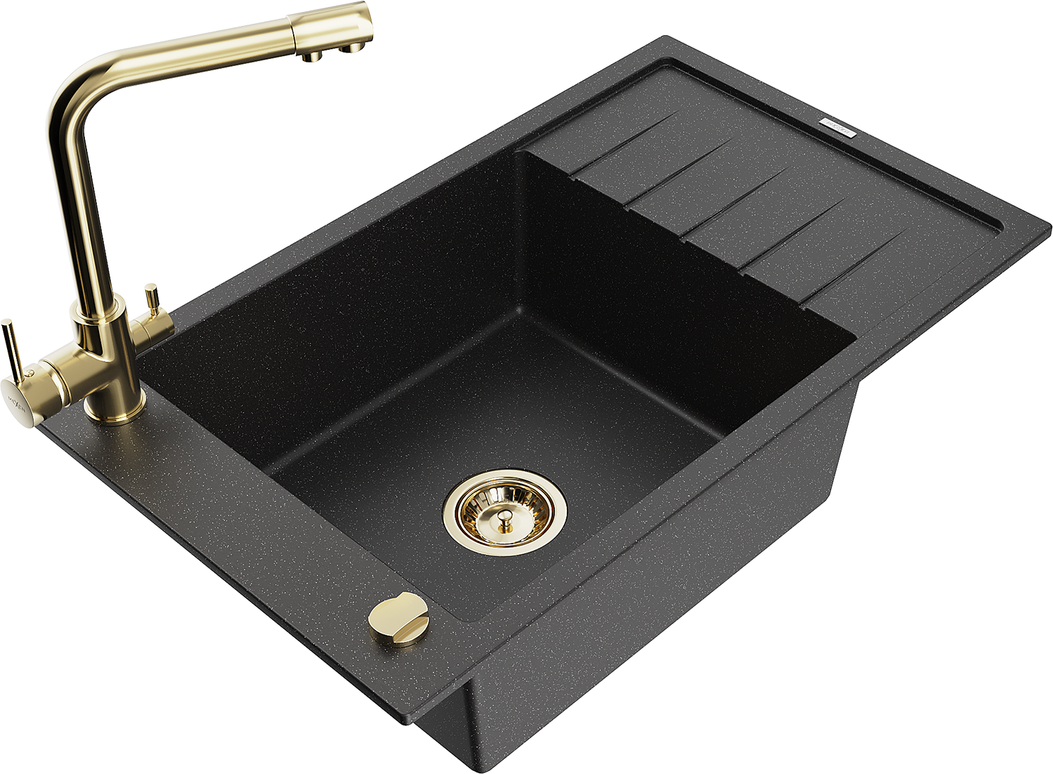 Mexen Elias évier en granit 1-bac avec égouttoir et robinet de cuisine Duero, noir/argent métallisé - 6511-73-671600-50