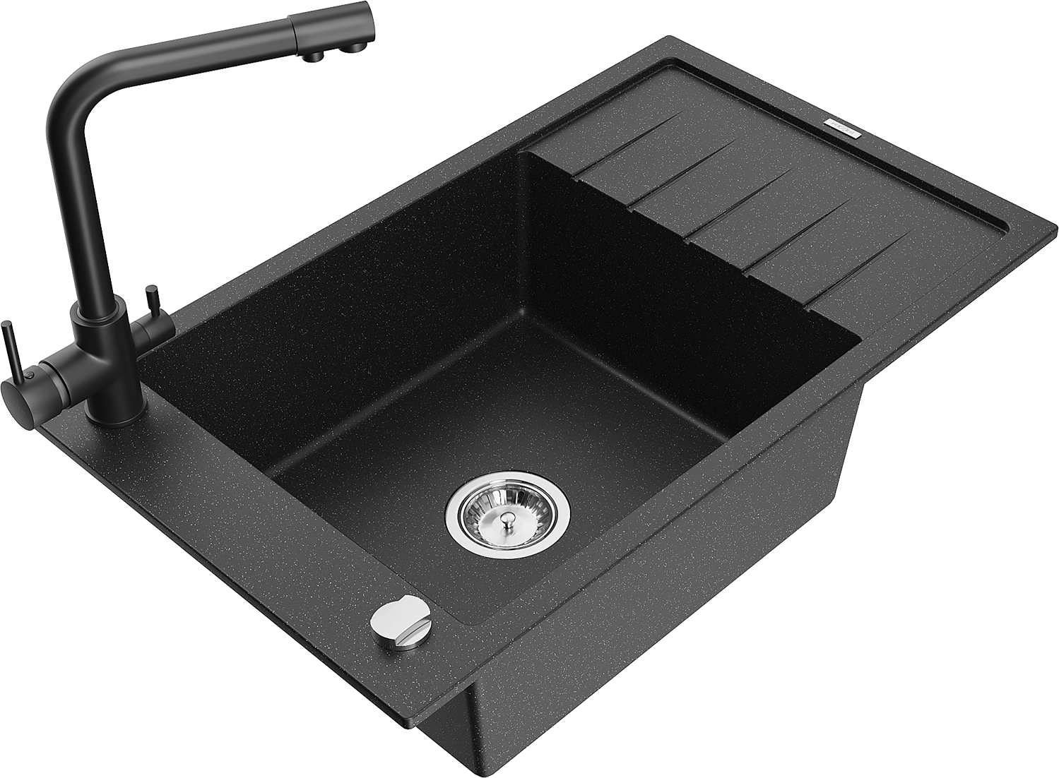 Mexen Elias évier en granit 1 bac avec égouttoir et mitigeur de cuisine Duero, noir/métallique argent - 6511-73-671600-70