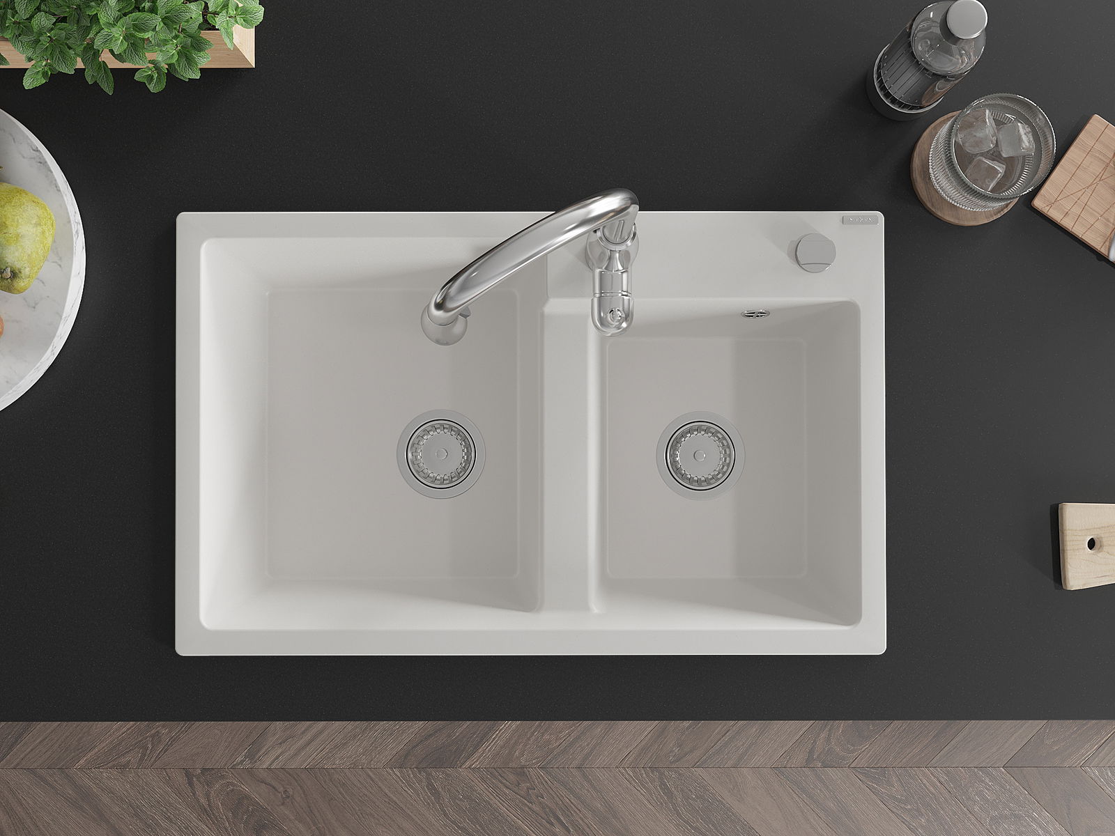 Mexen Tomas évier en granit 2 bacs avec mitigeur de cuisine Savita, blanc - 6516-20-672601-00