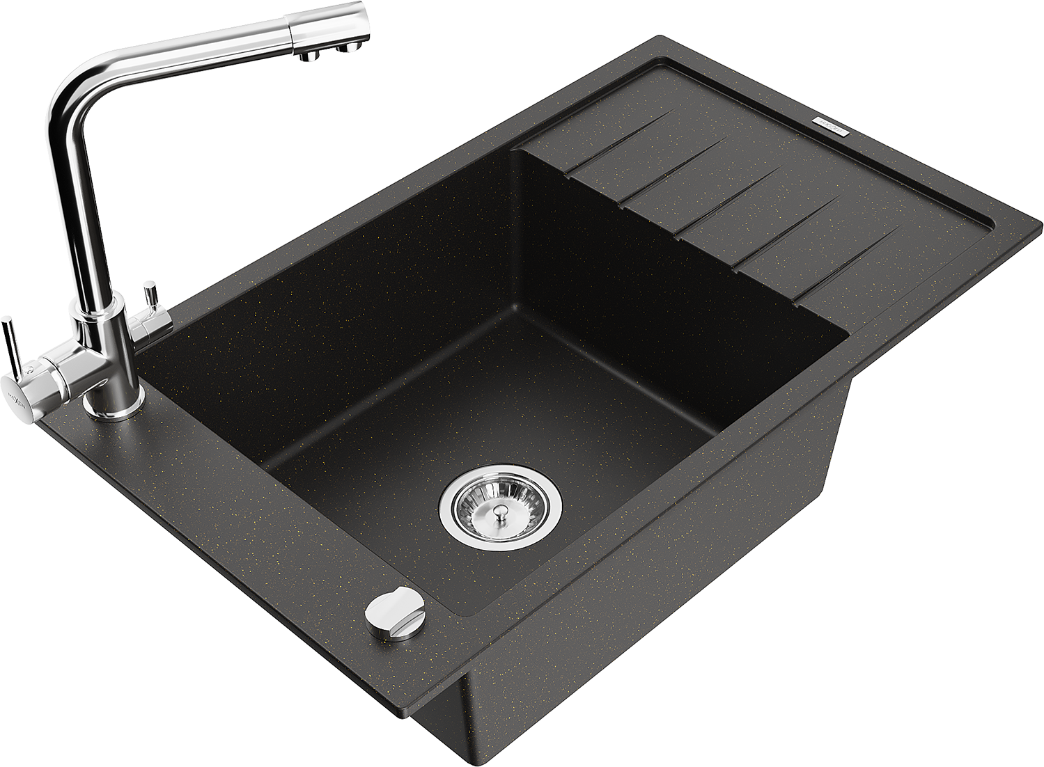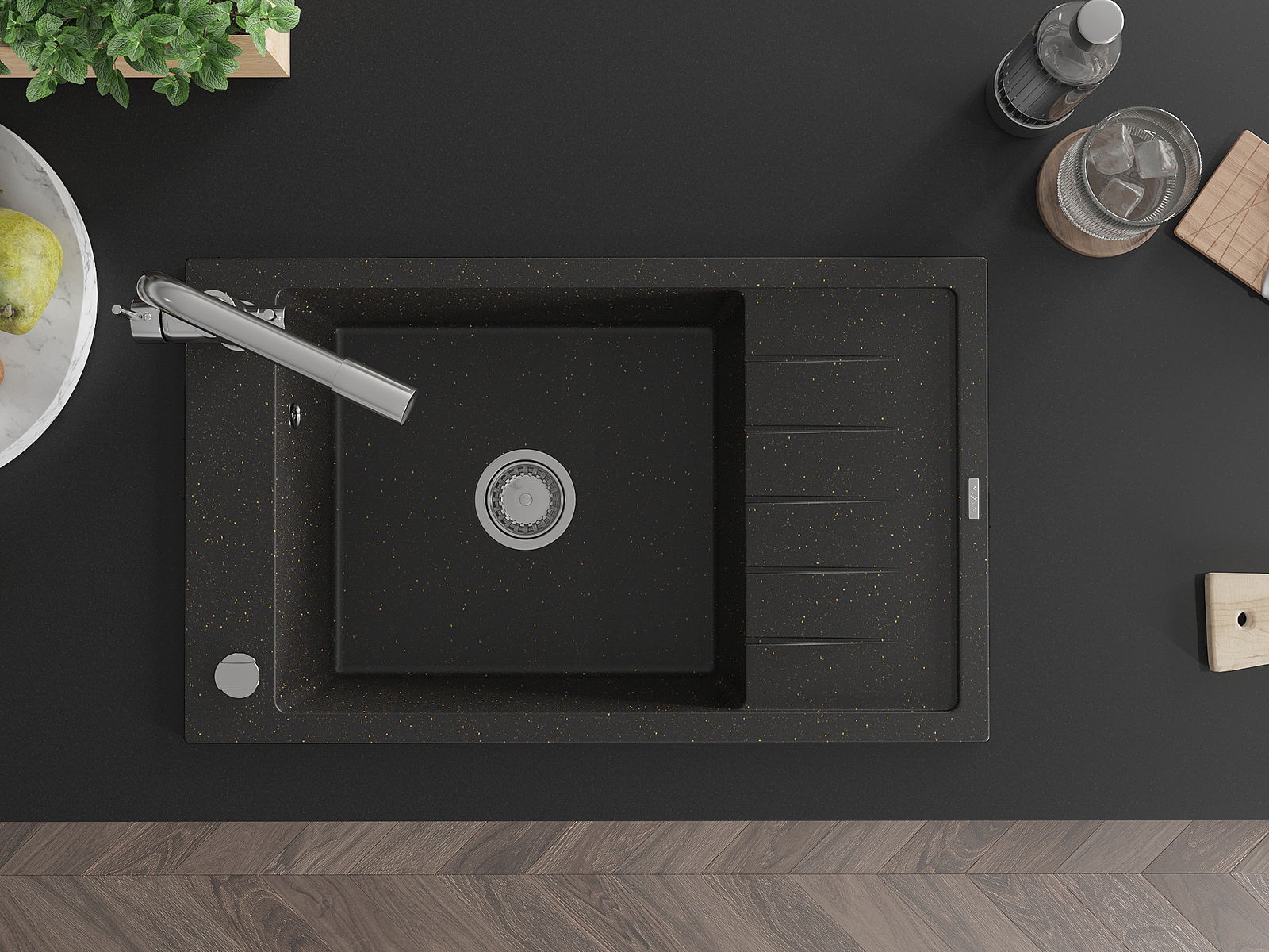 Mexen Elias évier en granit 1 bac avec égouttoir et robinet de cuisine Duero, noir/doré métallisé - 6511-75-671600-00