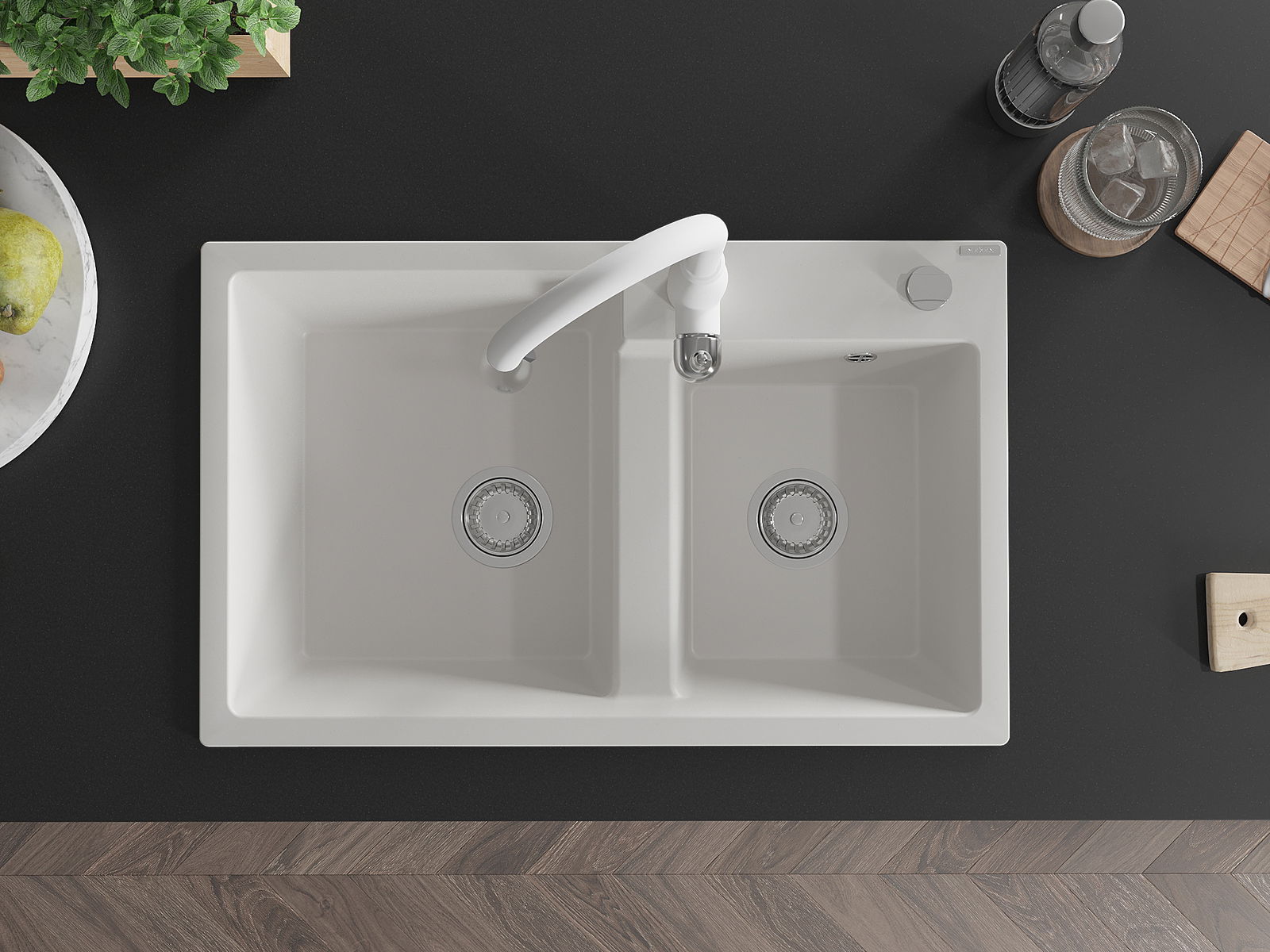 Mexen Tomas évier en granit à 2 bacs avec robinet de cuisine Savita, blanc - 6516-20-672601-20