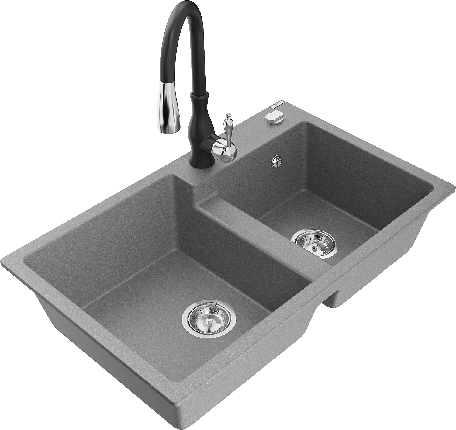 Mexen Tomas évier en granit à 2 bacs avec robinet de cuisine Savita, gris - 6516-71-672601-70