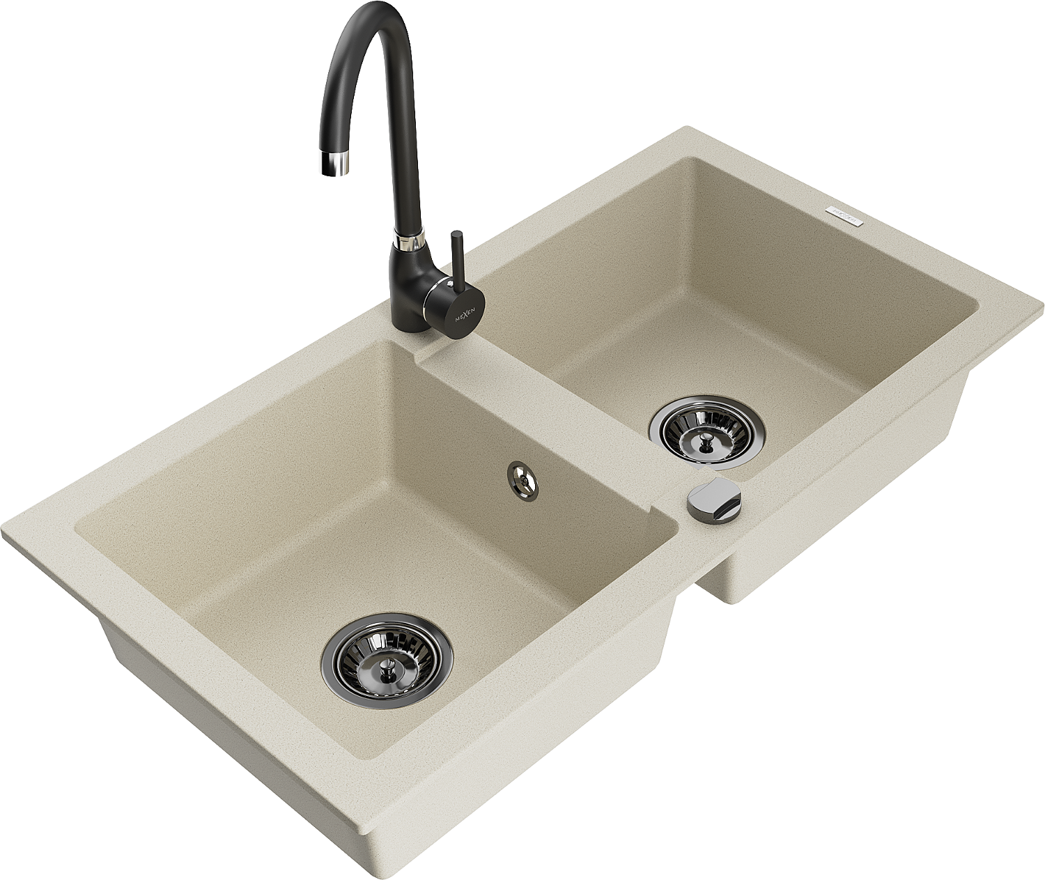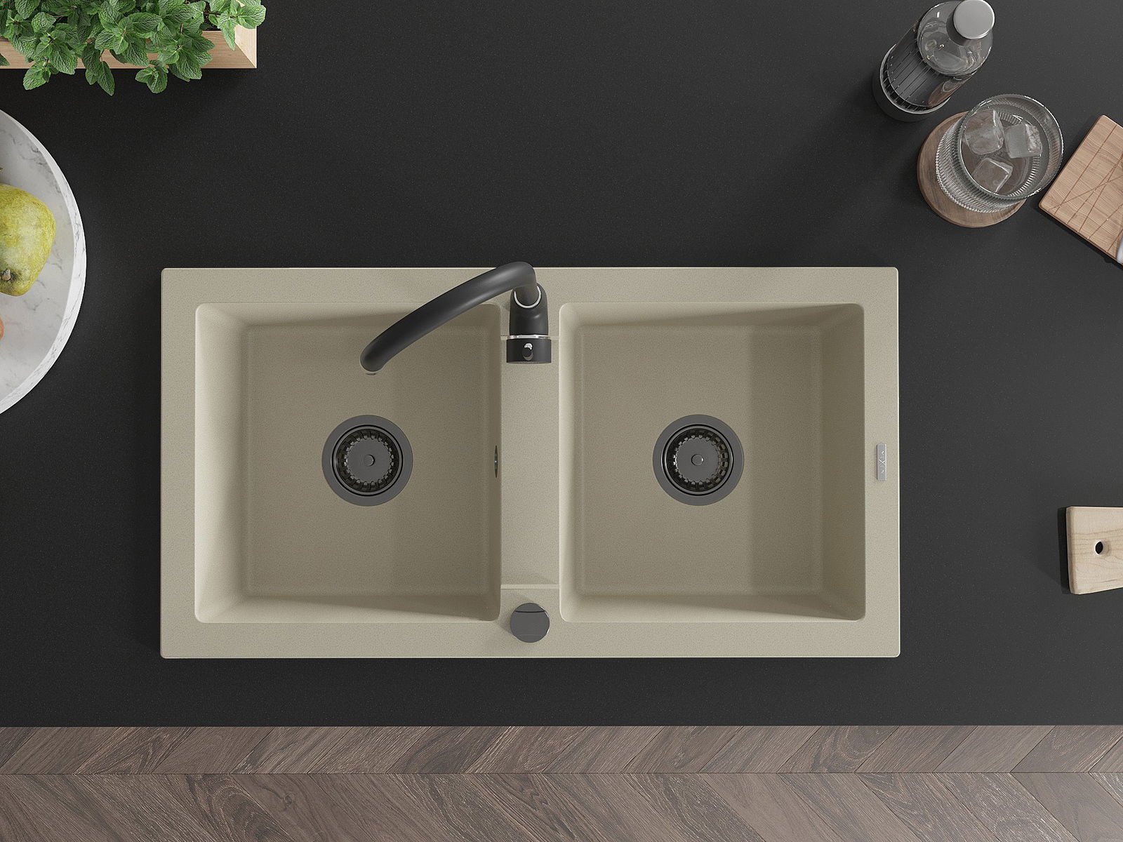 Mexen Mario évier en granit 2 bacs avec robinet de cuisine Telma, beige - 6504-69-670200-70