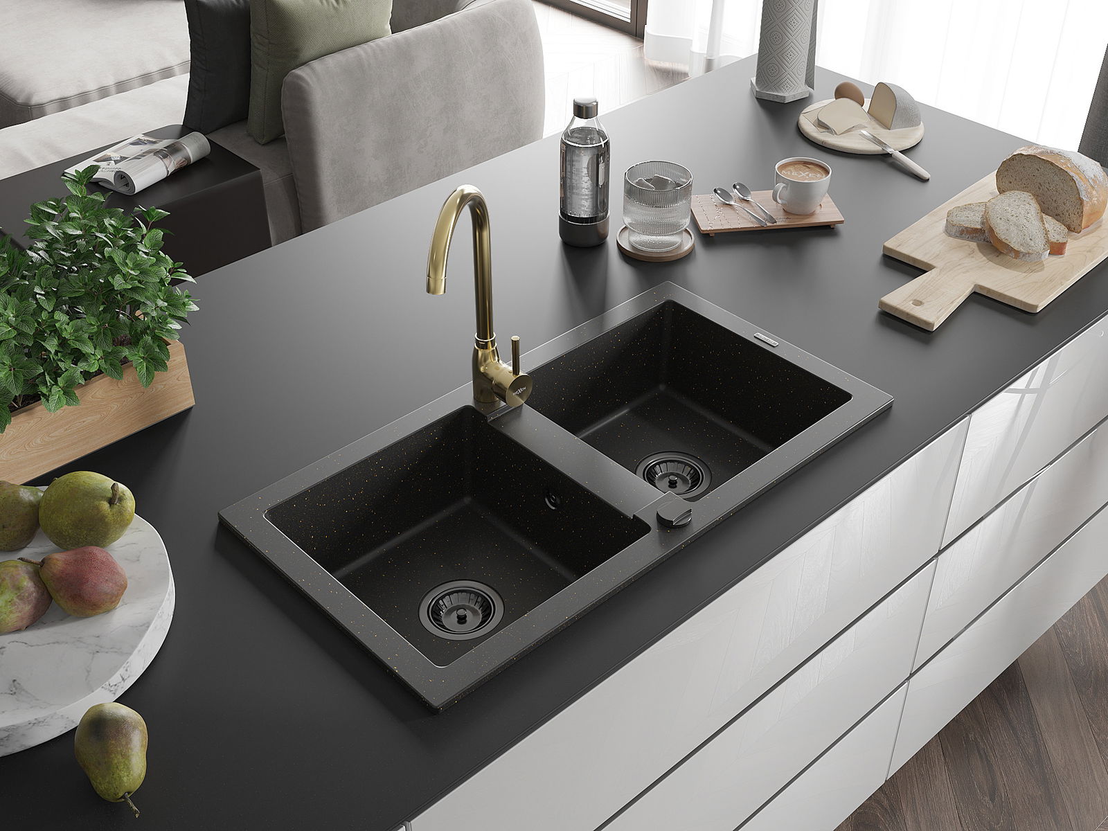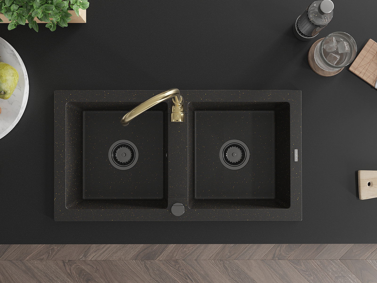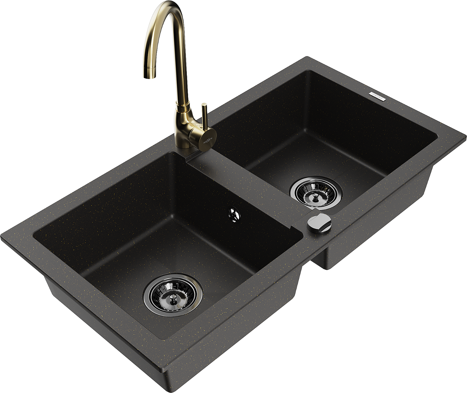 Mexen Mario évier de cuisine en granit 2 bacs avec robinet de cuisine Telma, noir/or - 6504-75-670200-50-B
