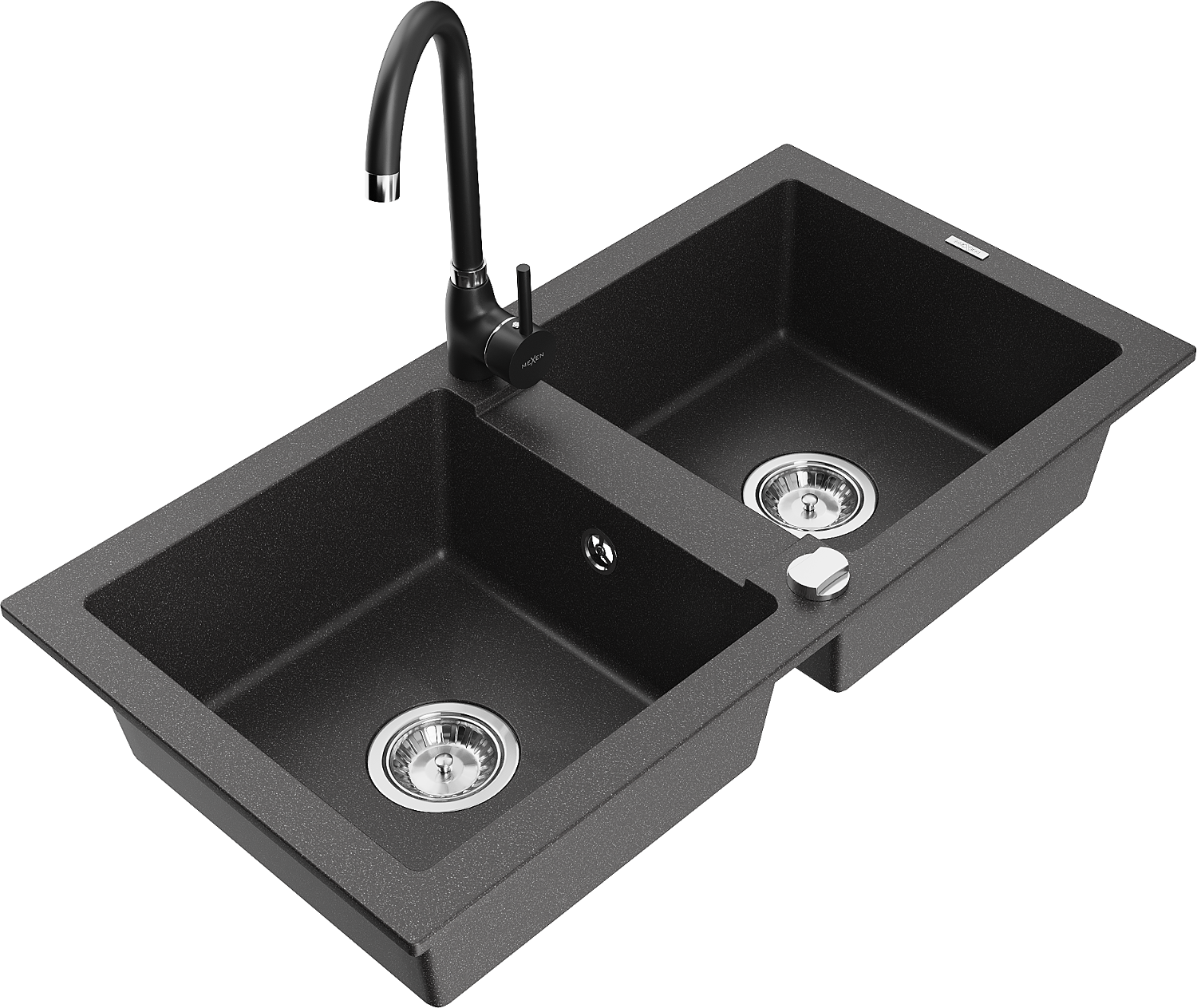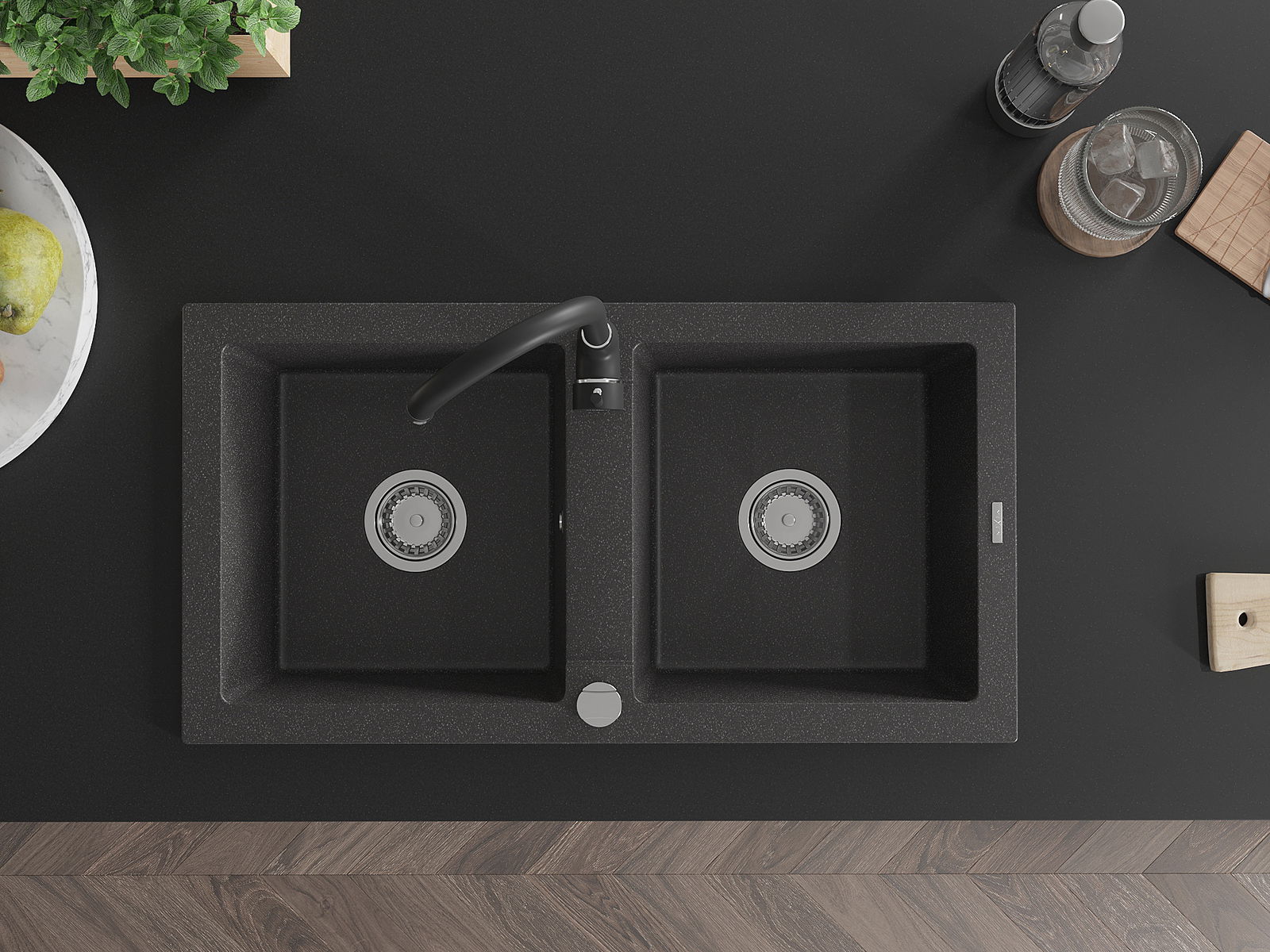 Mexen Mario évier en granit à 2 bacs avec robinet de cuisine Telma, noir moucheté - 6504-76-670200-70