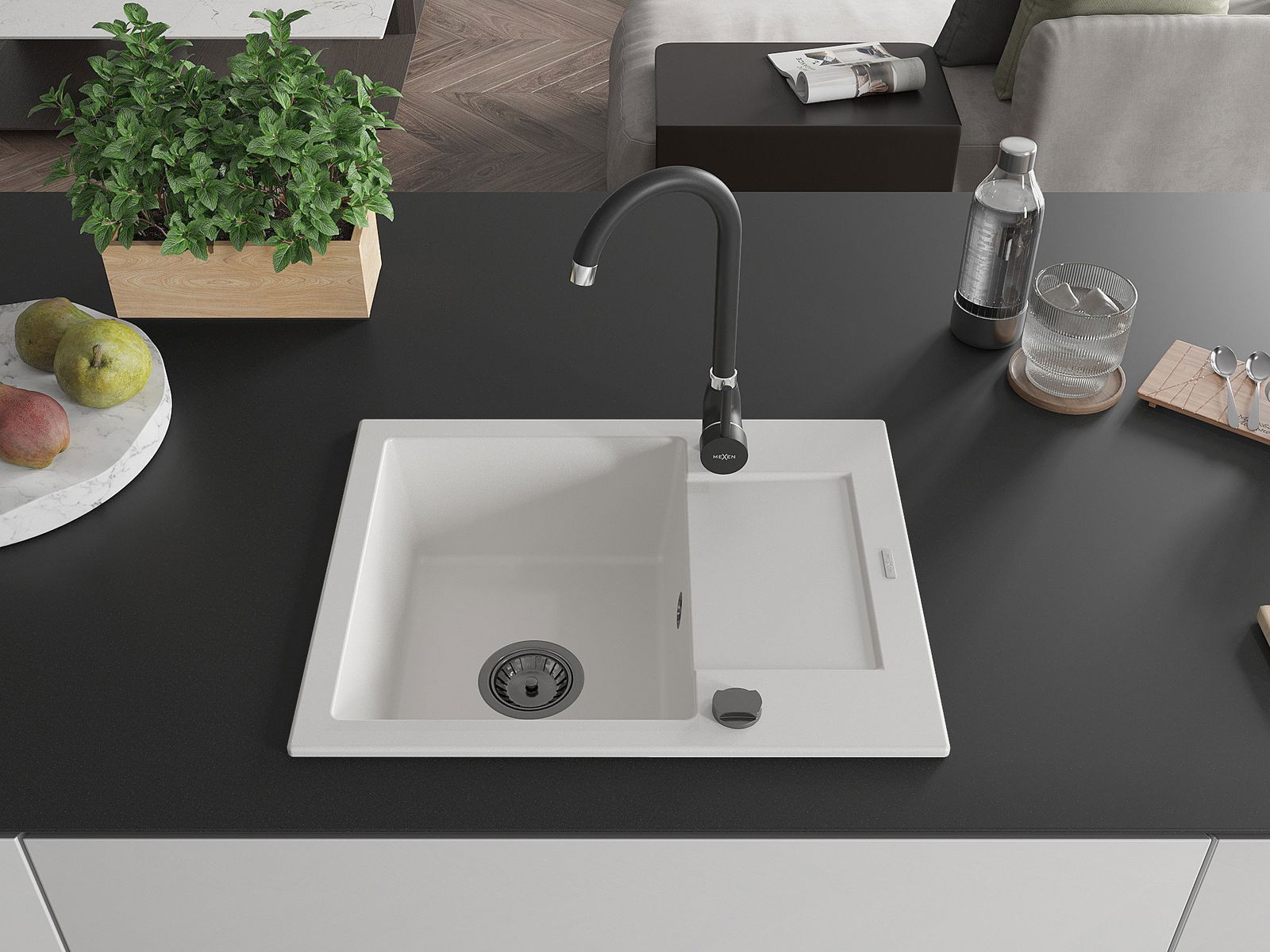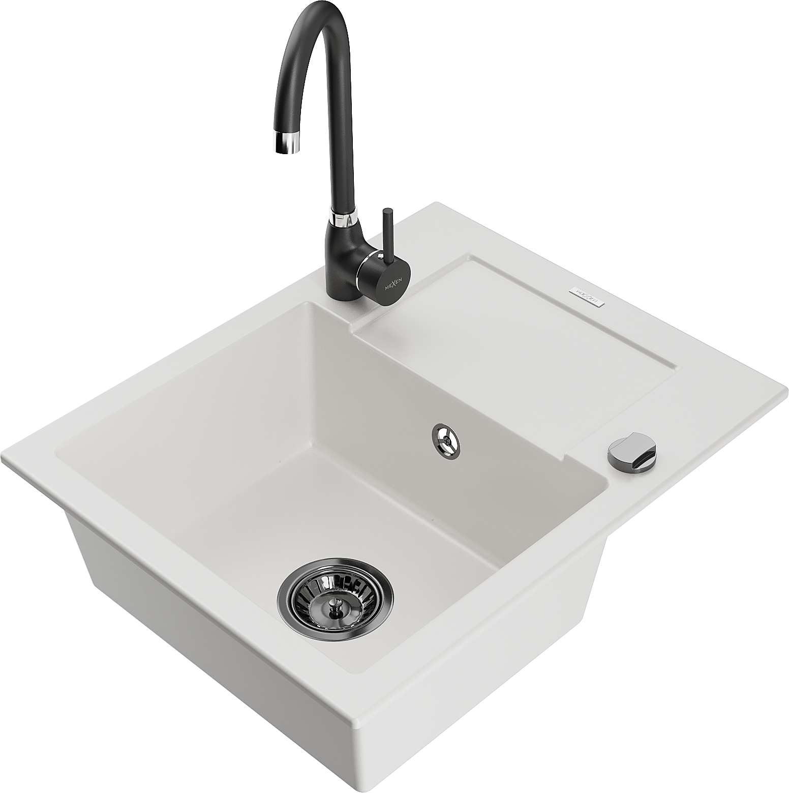 Mexen Enzo évier de cuisine en granit 1 bac avec égouttoir et robinet de cuisine Telma, blanc - 6506-20-670200-70