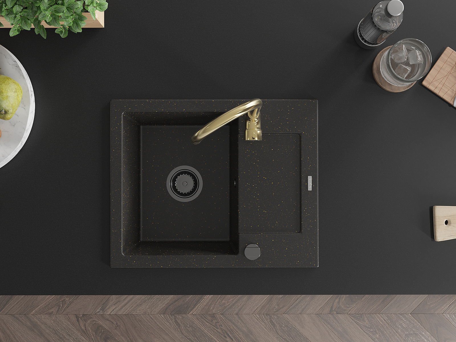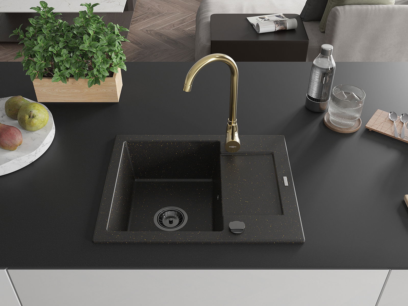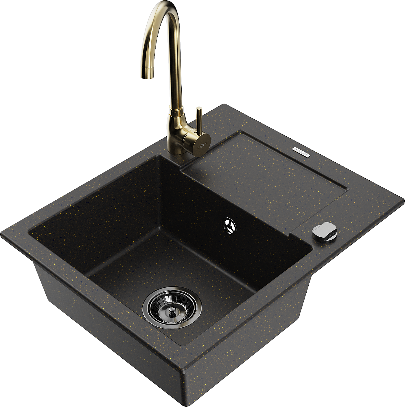 Mexen Enzo évier de cuisine en granit 1 bac avec égouttoir et robinet de cuisine Telma, noir/doré - 6506-75-670200-50-B