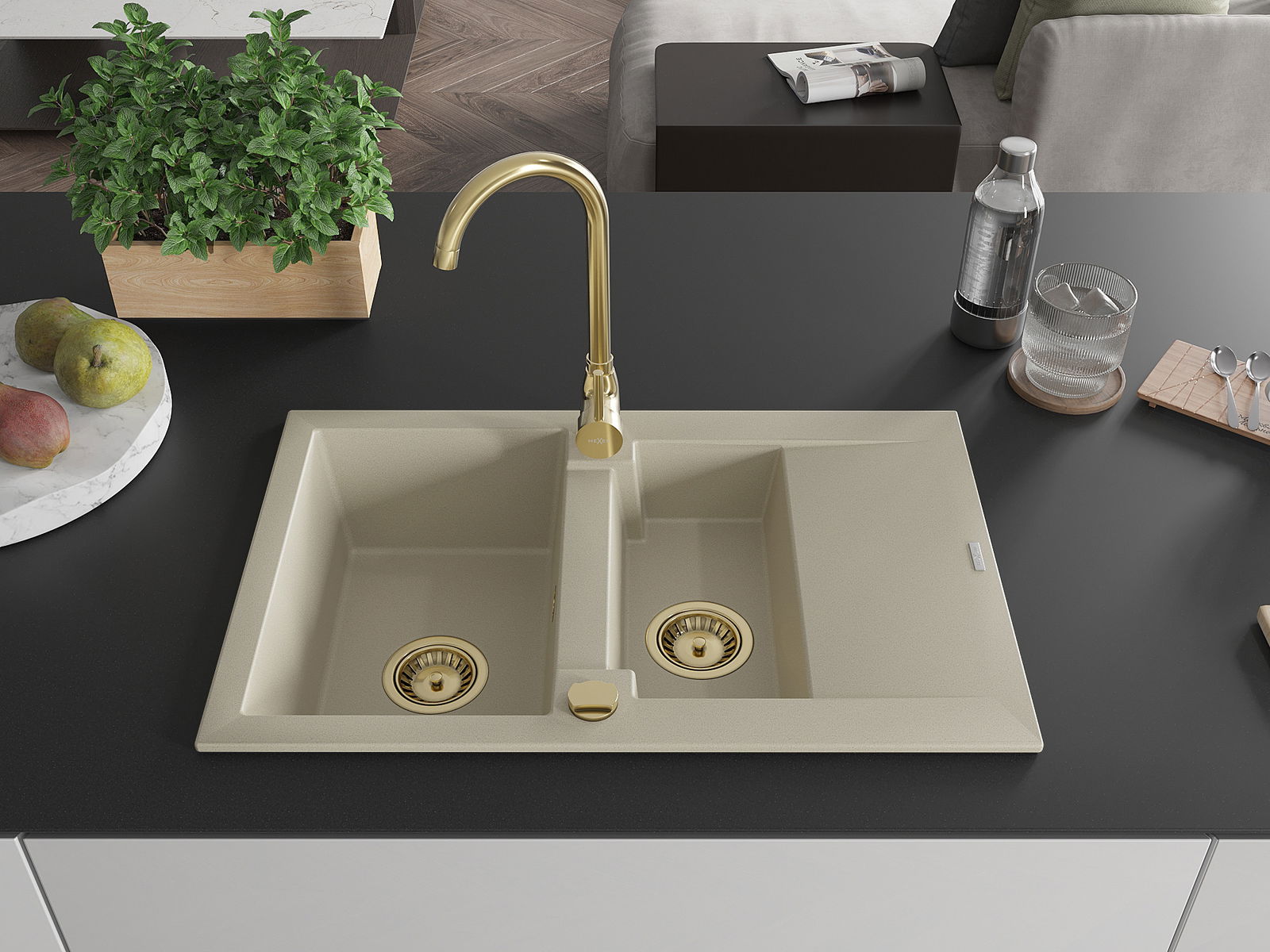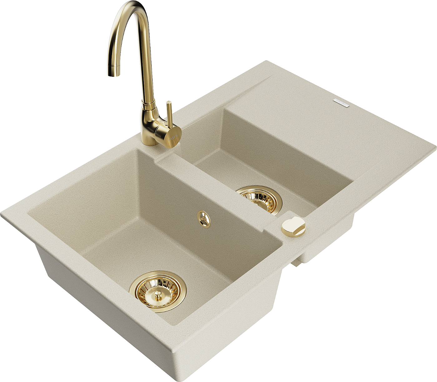 Mexen Gaspar évier en granit 1,5 cuves avec égouttoir et robinet de cuisine Telma, beige - 6507-69-670200-50