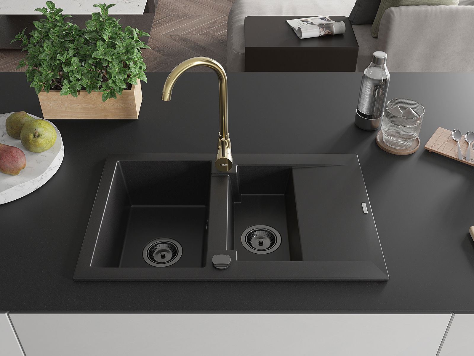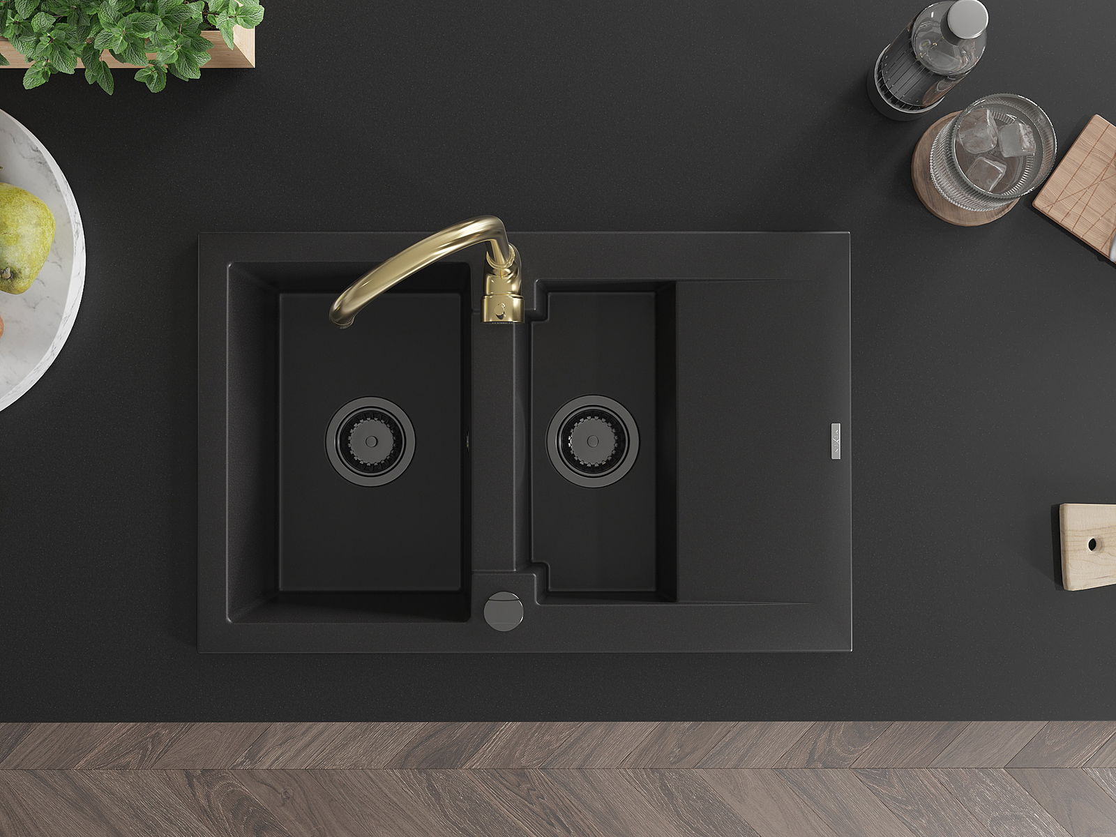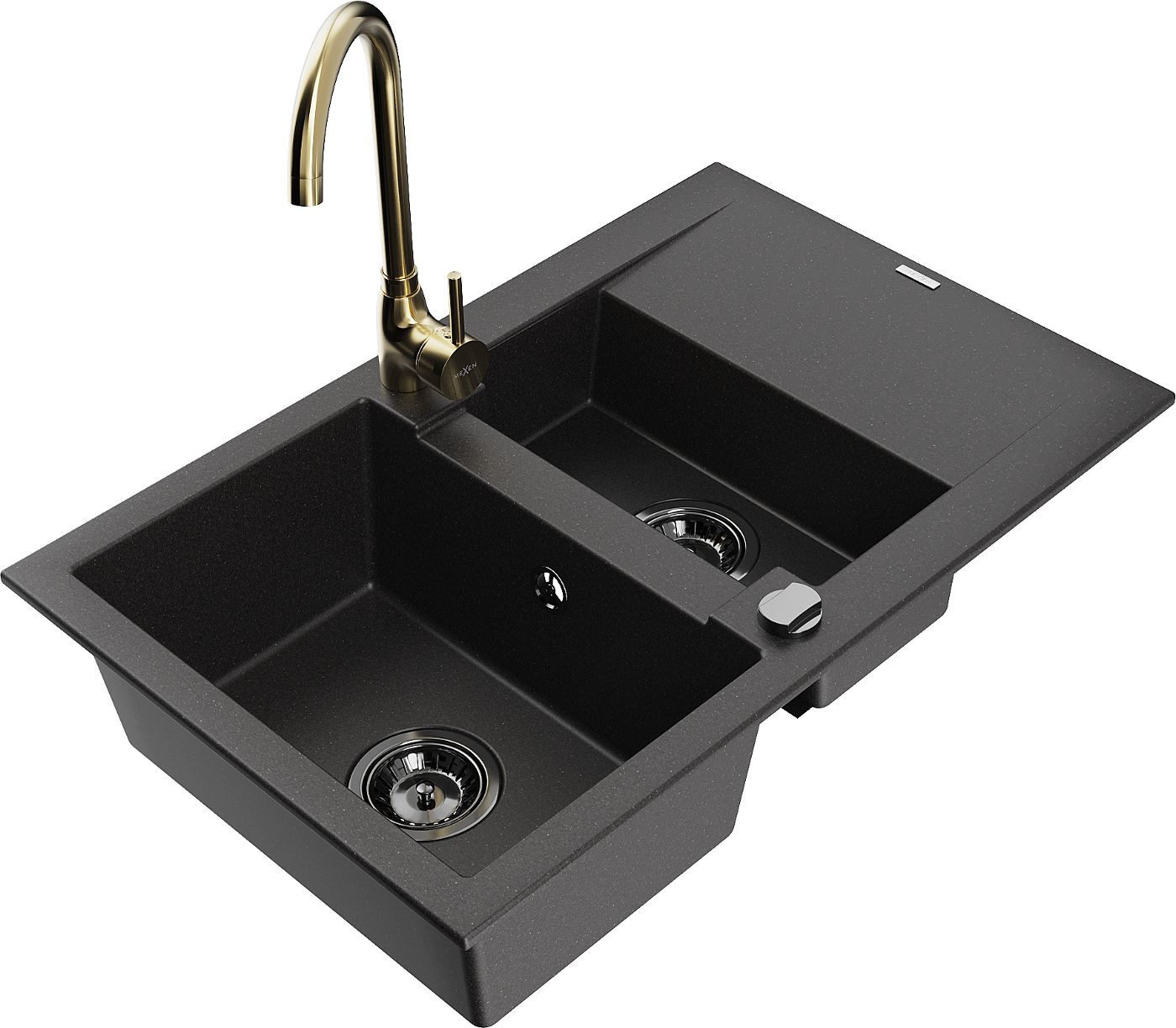 Mexen Gaspar évier en granit 1,5 bac avec égouttoir et robinet de cuisine Telma, noir - 6507-77-670200-50-B