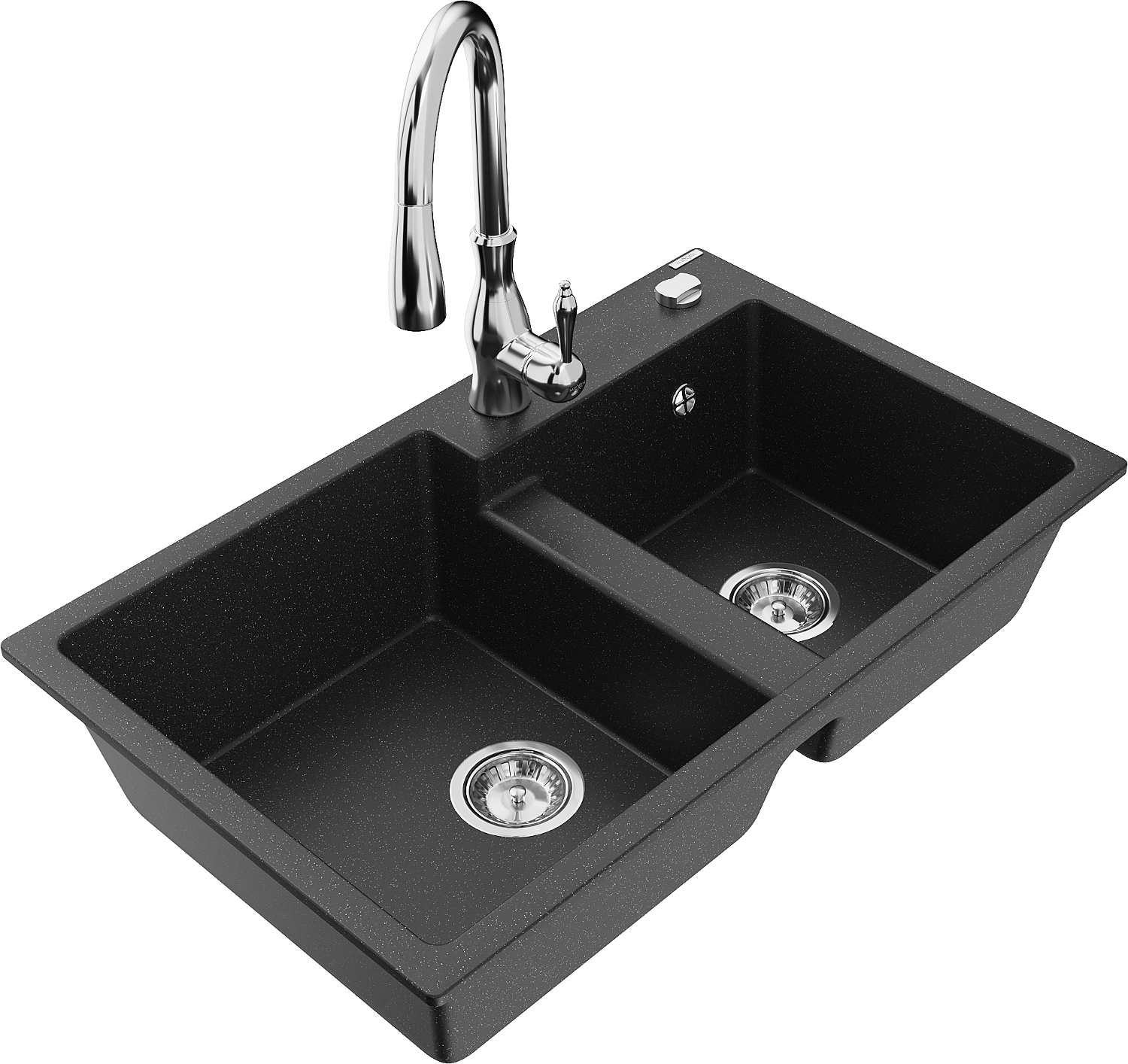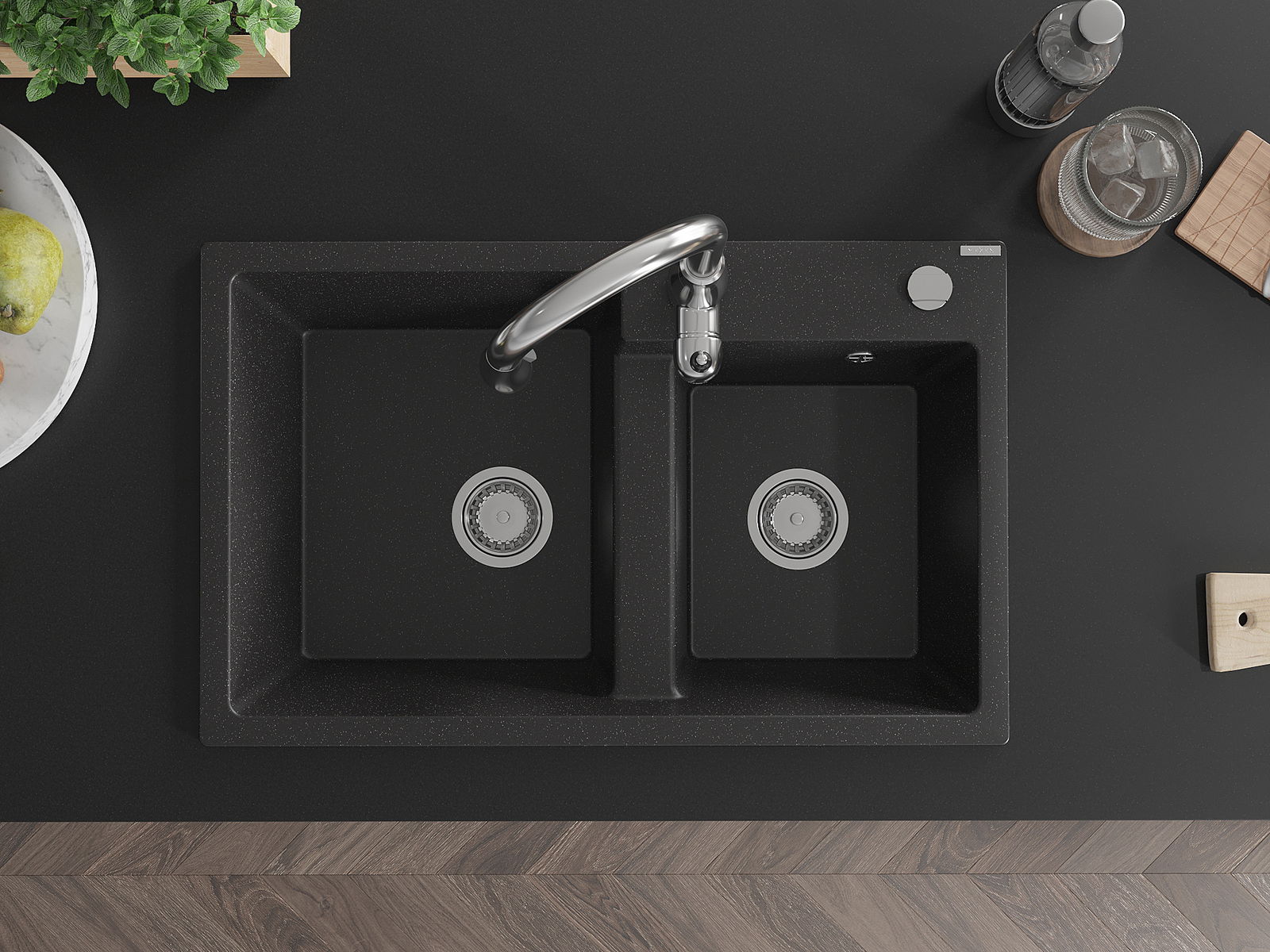 Mexen Tomas évier en granit à 2 bacs avec mitigeur de cuisine Savita, noir/métal argenté - 6516-73-672601-00