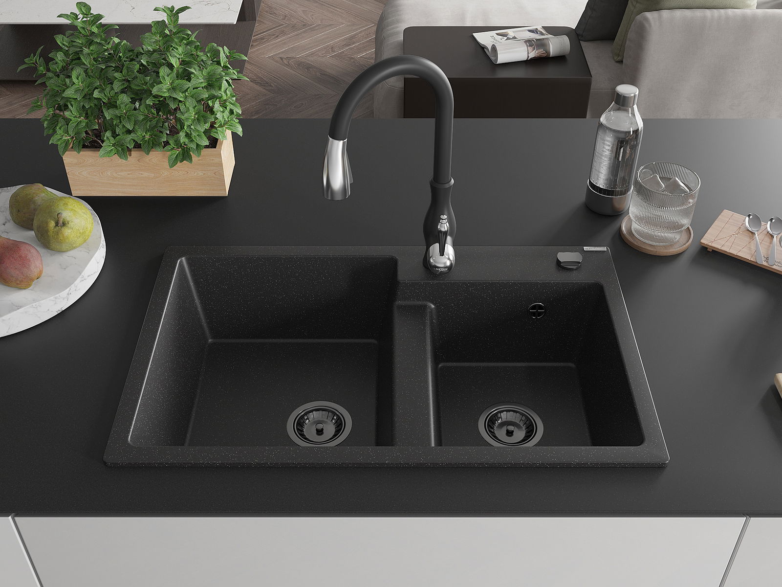 Mexen Tomas évier en granit 2 bacs avec robinet de cuisine Savita, noir/argent métallisé - 6516-73-672601-70-B