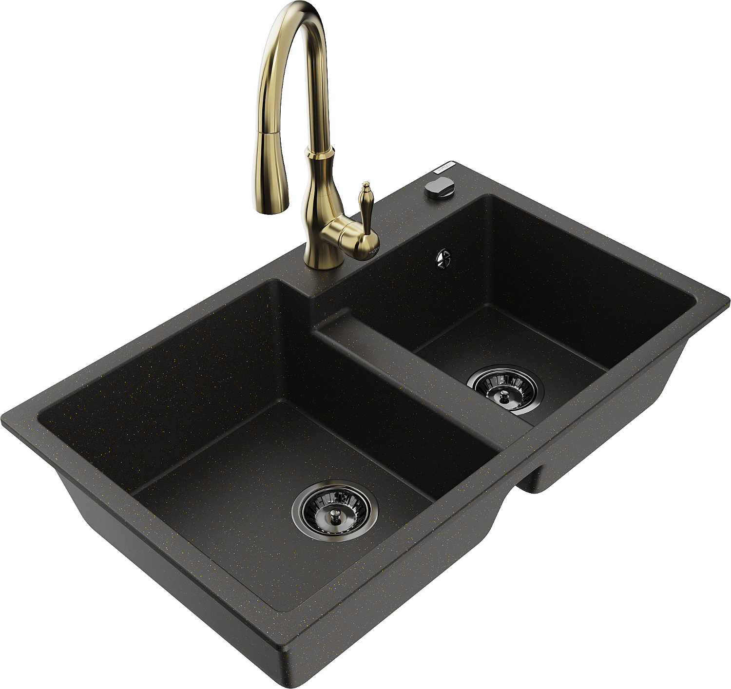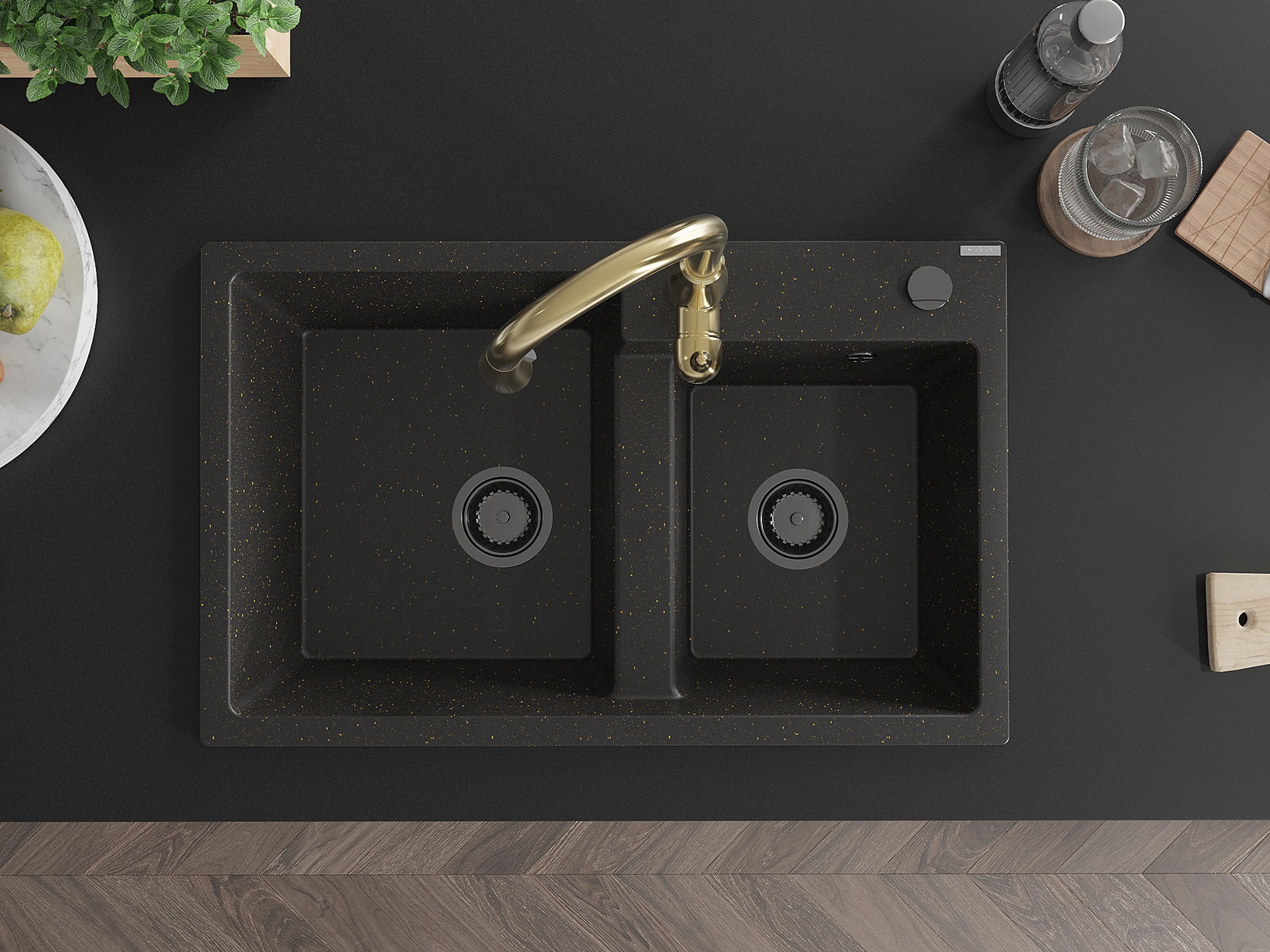 Mexen Tomas évier en granit 2 bacs avec robinet de cuisine Savita, noir/or métallisé - 6516-75-672601-50-B