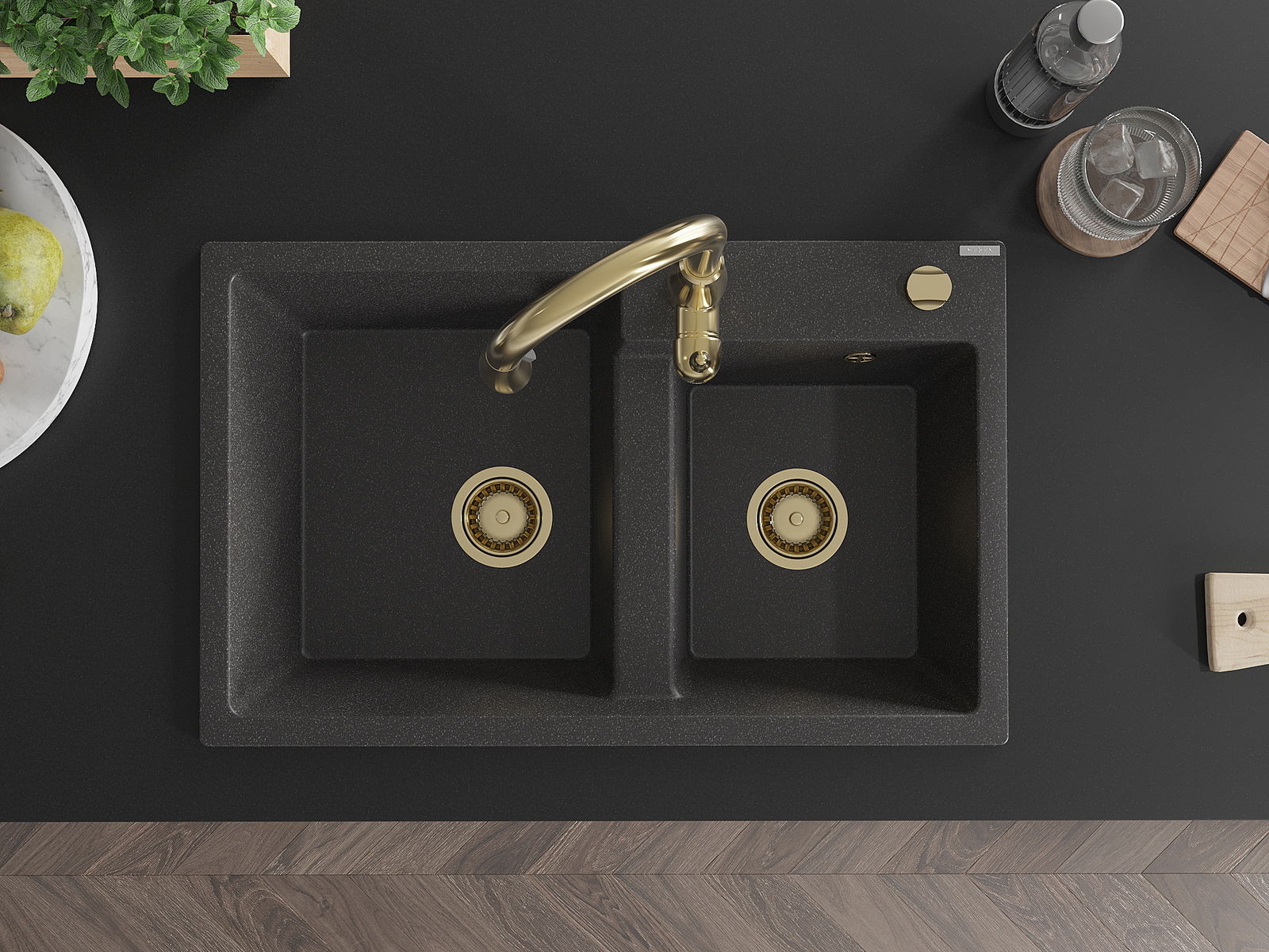 Mexen Tomas évier en granit à 2 bacs avec mitigeur de cuisine Savita, noir tacheté - 6516-76-672601-50