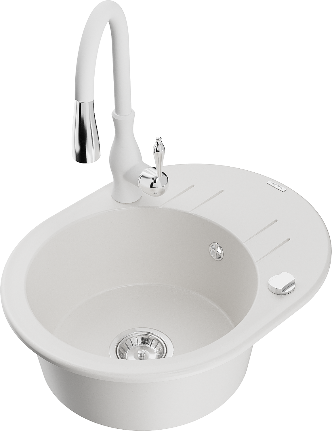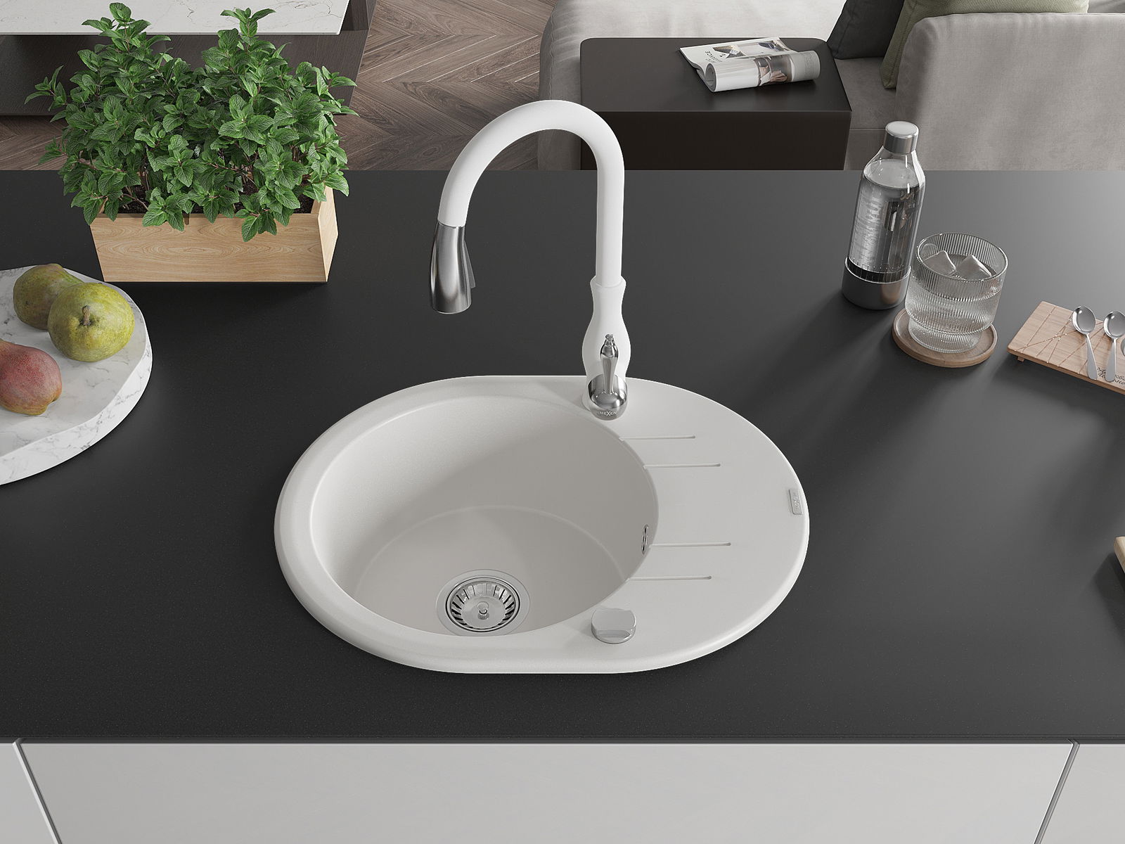 Mexen Kevin évier de cuisine en granit 1 bac avec égouttoir et robinet de cuisine Savita, blanc - 6517-20-672601-20