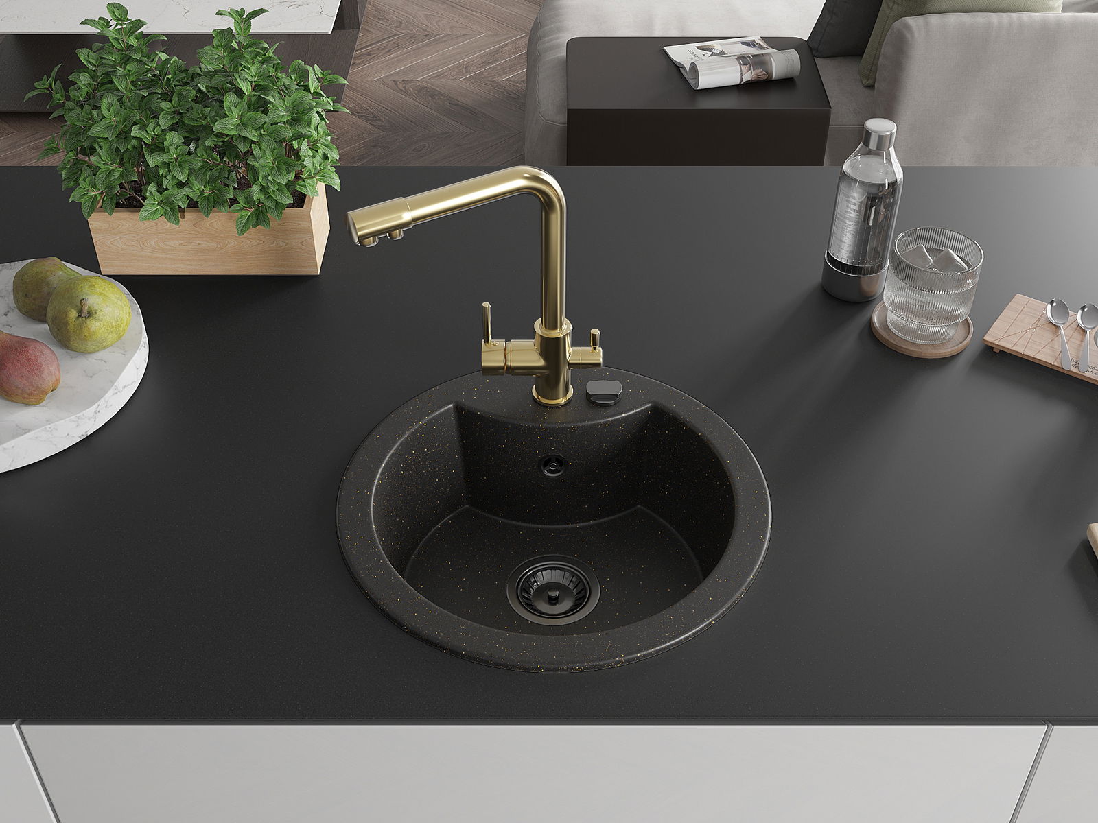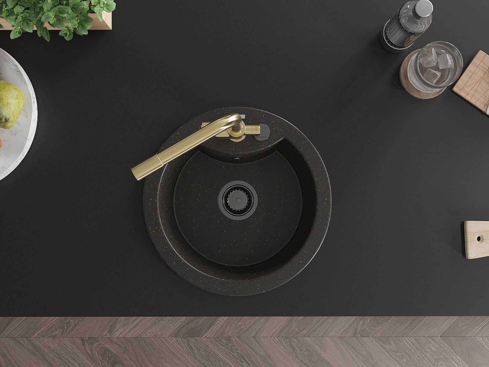 Mexen Diego évier en granit à 1 bac avec robinet de cuisine Duero, noir/doré métallisé - 6512-75-671600-50-B
