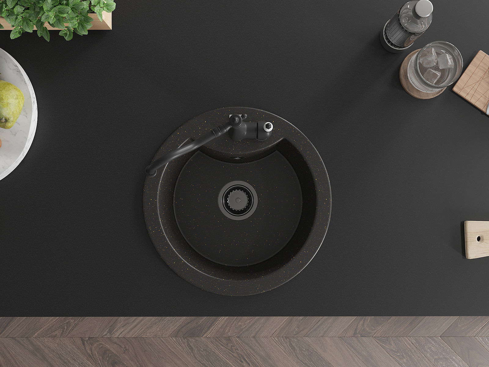 Mexen Diego évier en granit 1 bac avec robinet de cuisine Carla, noir/métallisé doré - 6512-75-670700-70-B