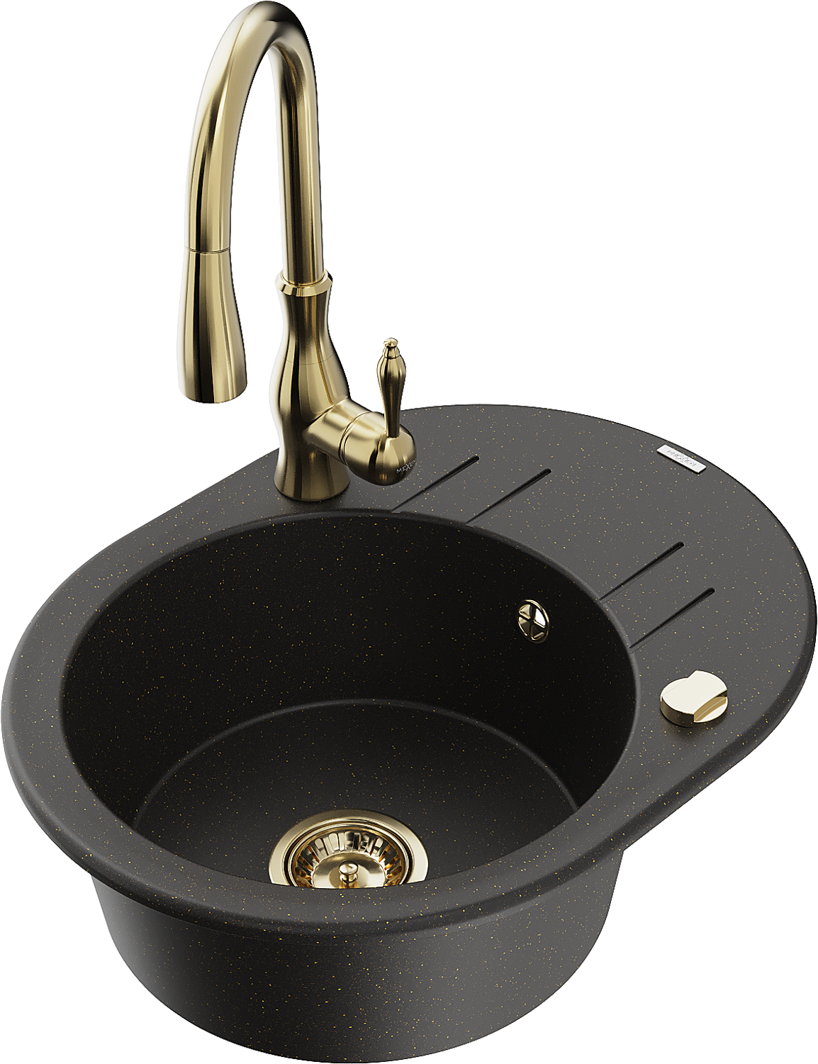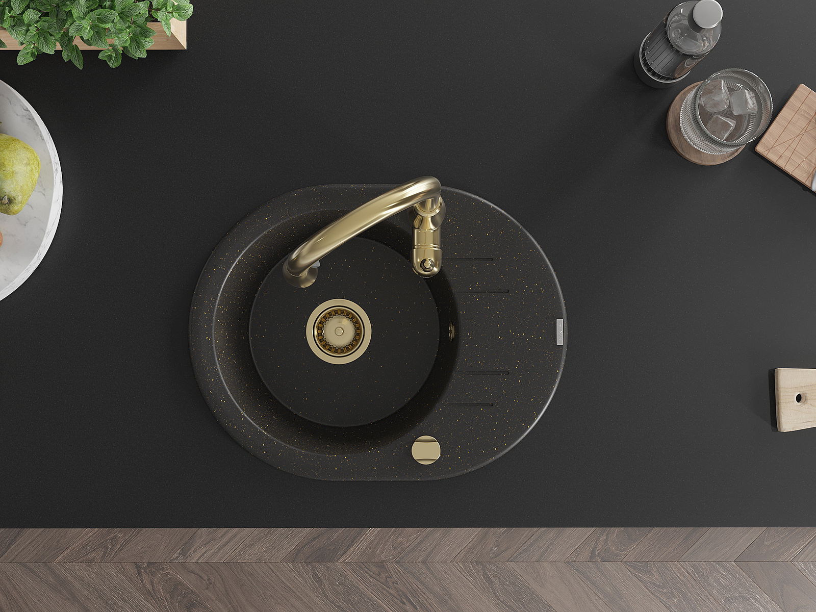 Mexen Kevin évier en granit à 1 bac avec égouttoir et robinet de cuisine Savita, noir/métallisé doré - 6517-75-672601-50