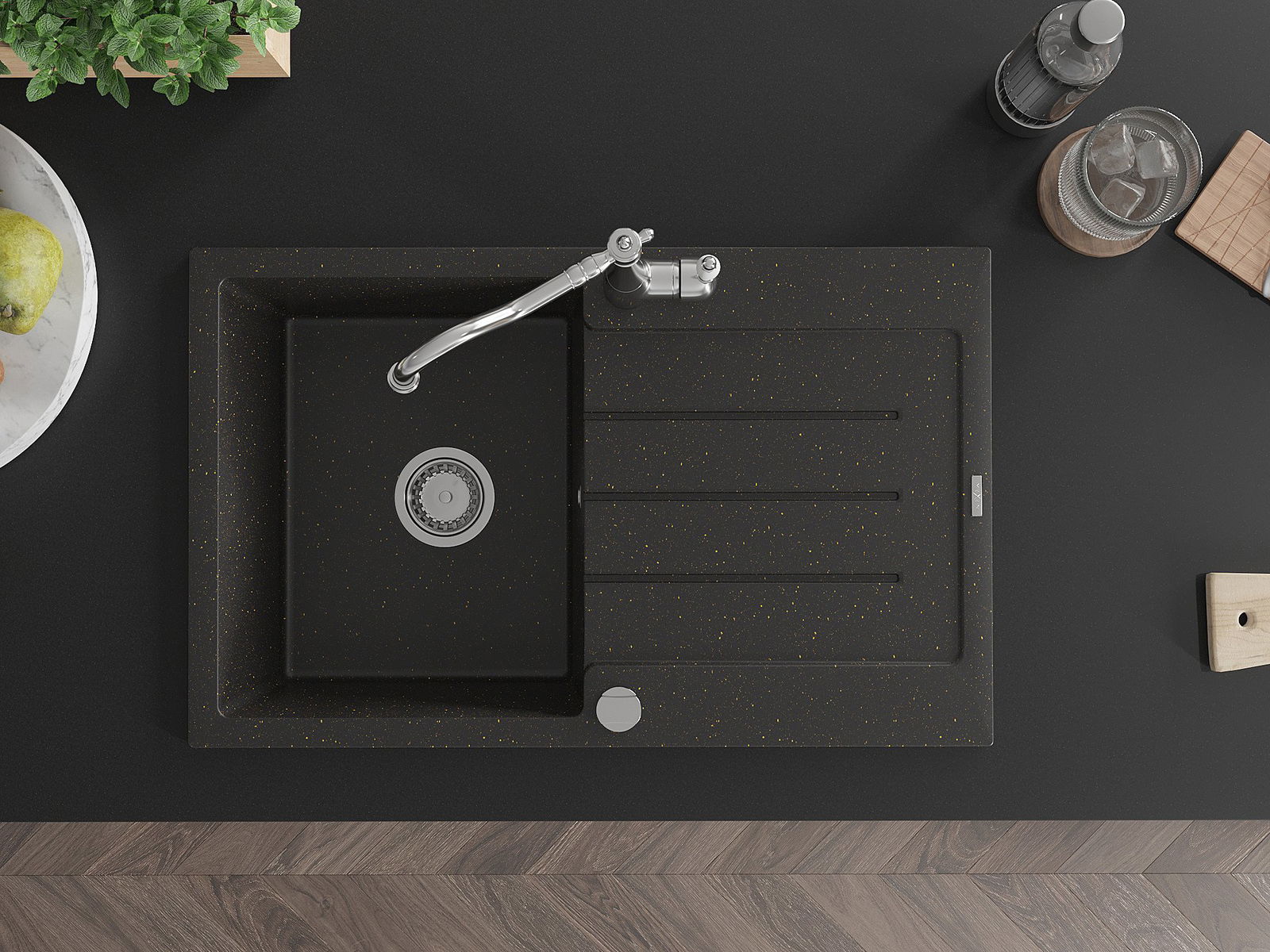 Évier granitique 1 bac avec égouttoir et robinet de cuisine Mexen Bruno Carla, noir/doré métalisé - 6513-75-670700-00