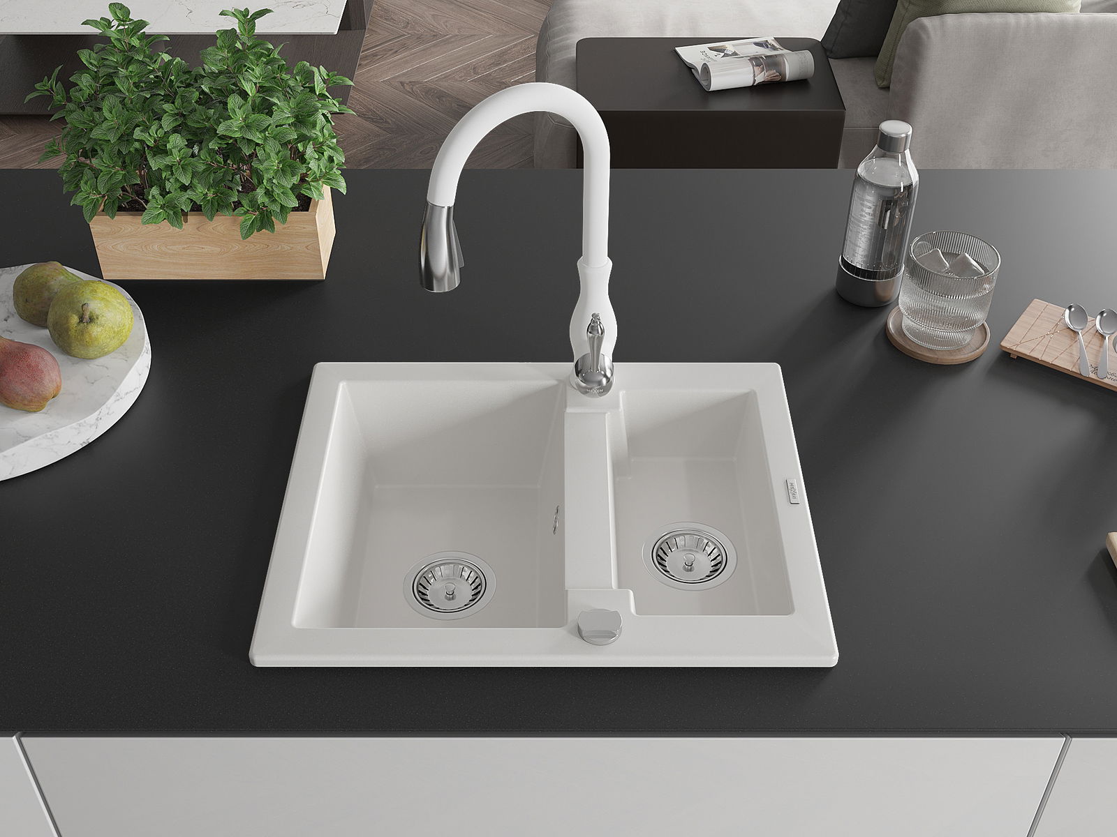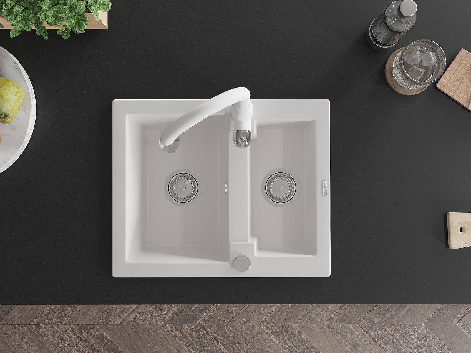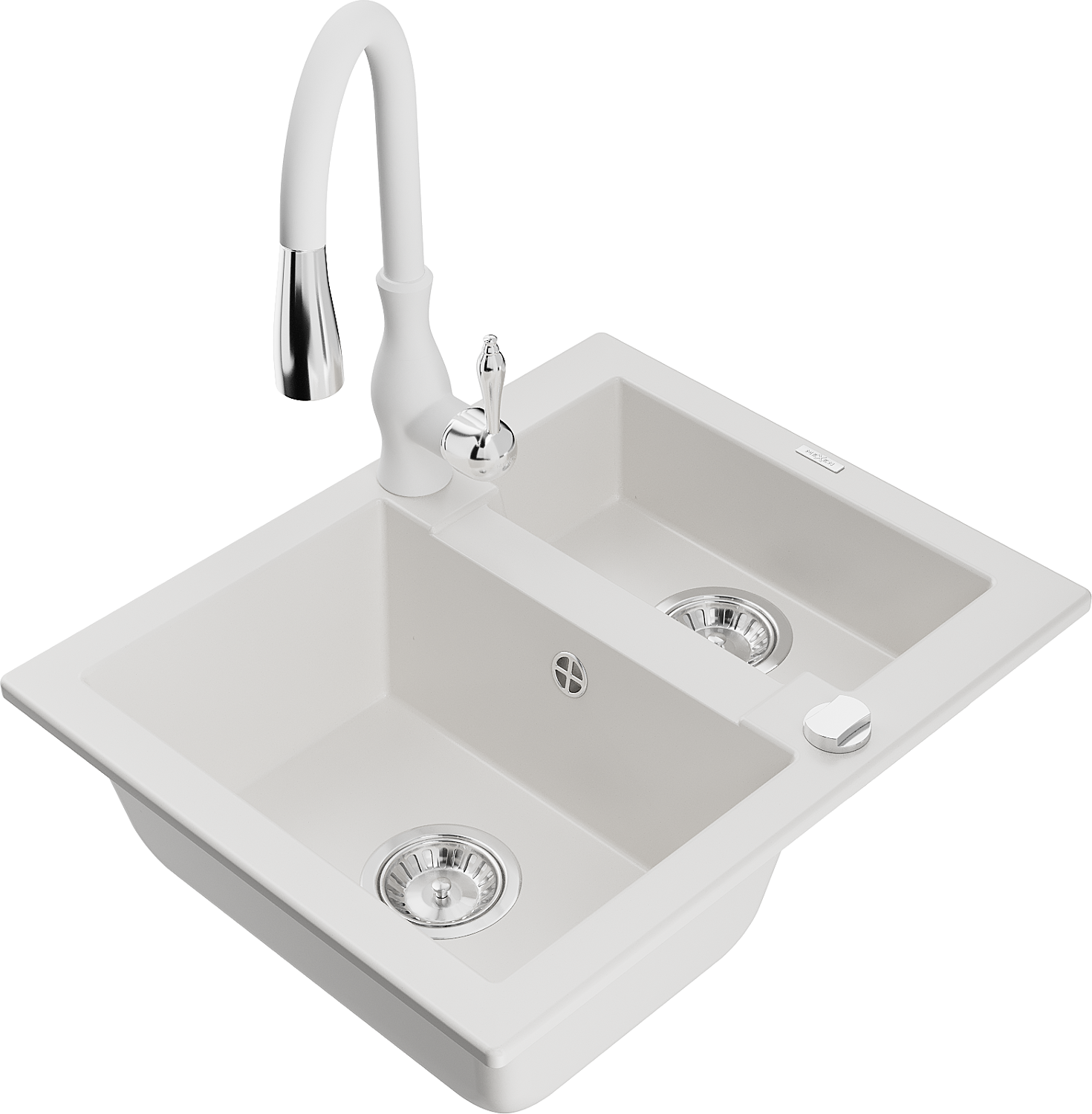 Mexen Carlos évier en granit 1,5 bac avec mitigeur d'évier Savita, blanc - 6518-20-672601-20