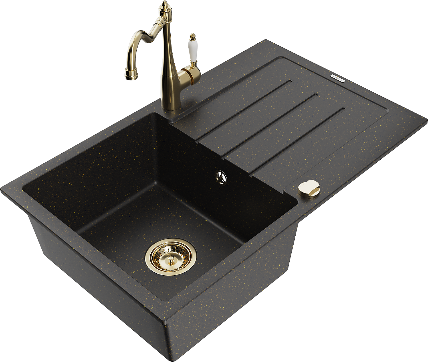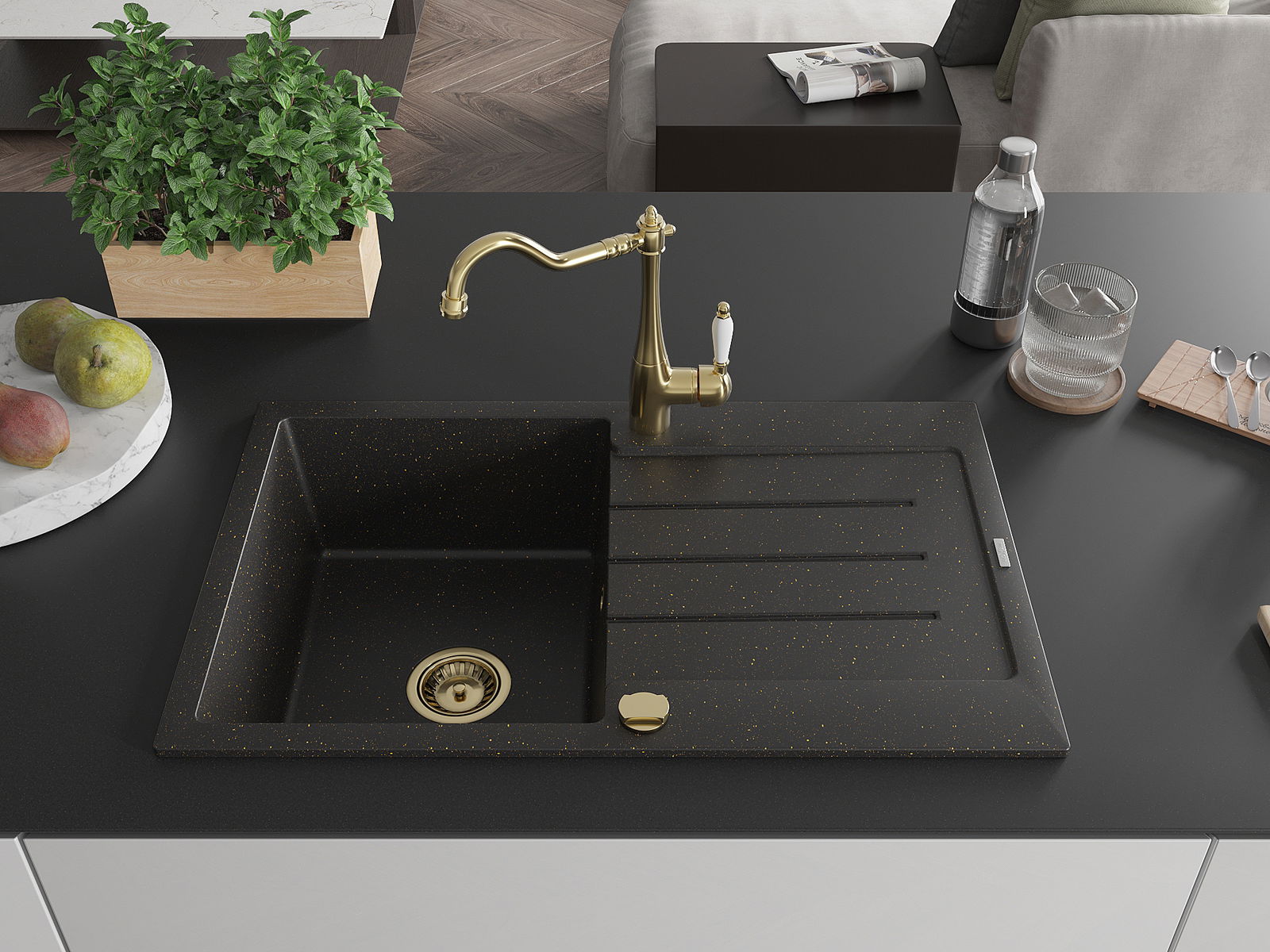 Mexen Bruno évier de cuisine en granit 1 bac avec égouttoir et robinet de cuisine Carla, noir/doré métallisé - 6513-75-670700-5?