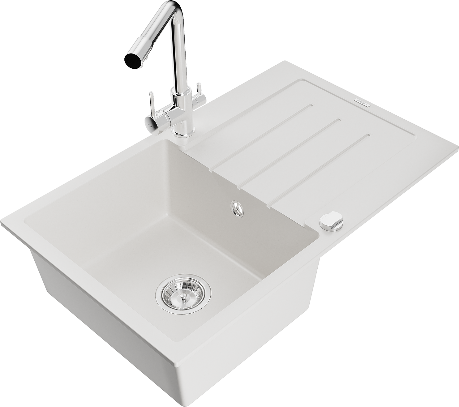 Mexen Bruno évier en granit 1 bac avec égouttoir et robinet de cuisine Duero, blanc - 6513-20-671600-00