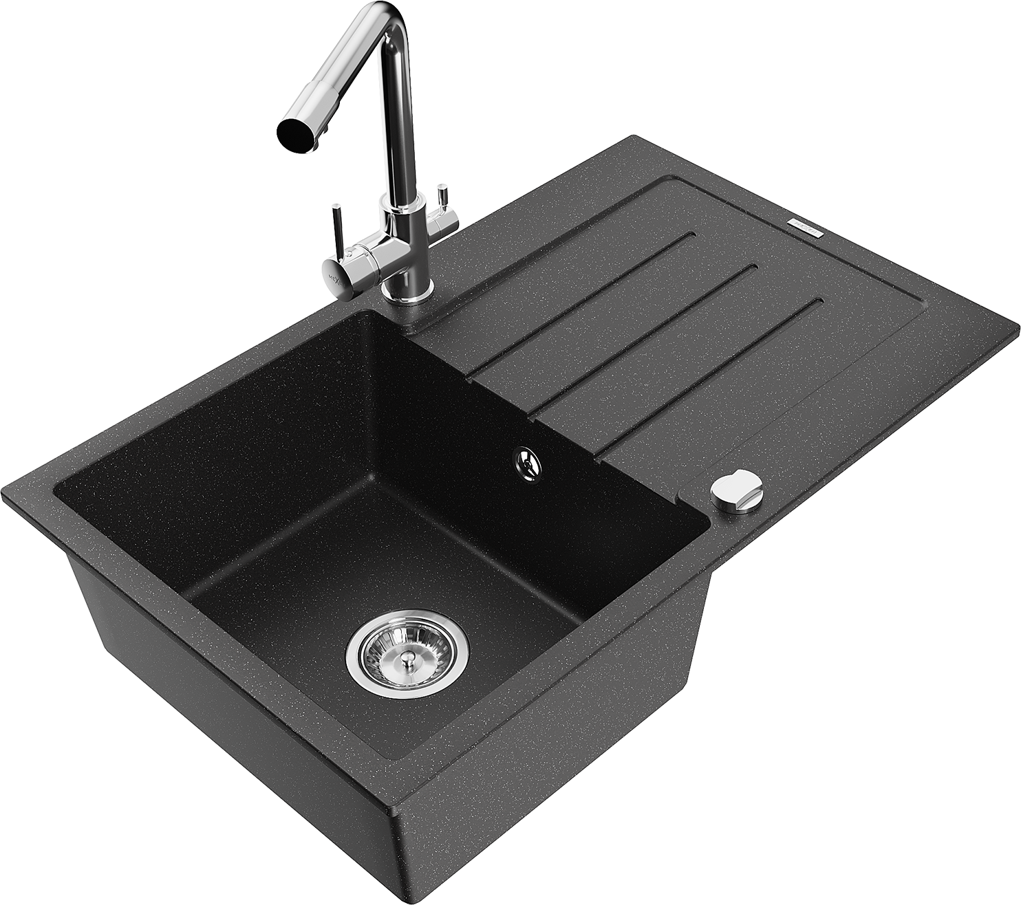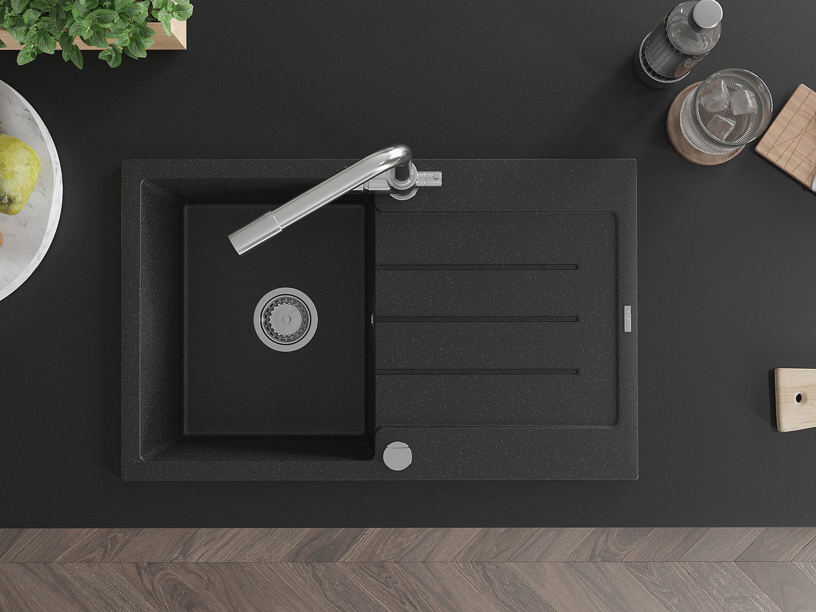 Mexen Bruno évier en granit 1 bac avec égouttoir et robinet de cuisine Duero, noir/argent métallisé - 6513-73-671600-00
