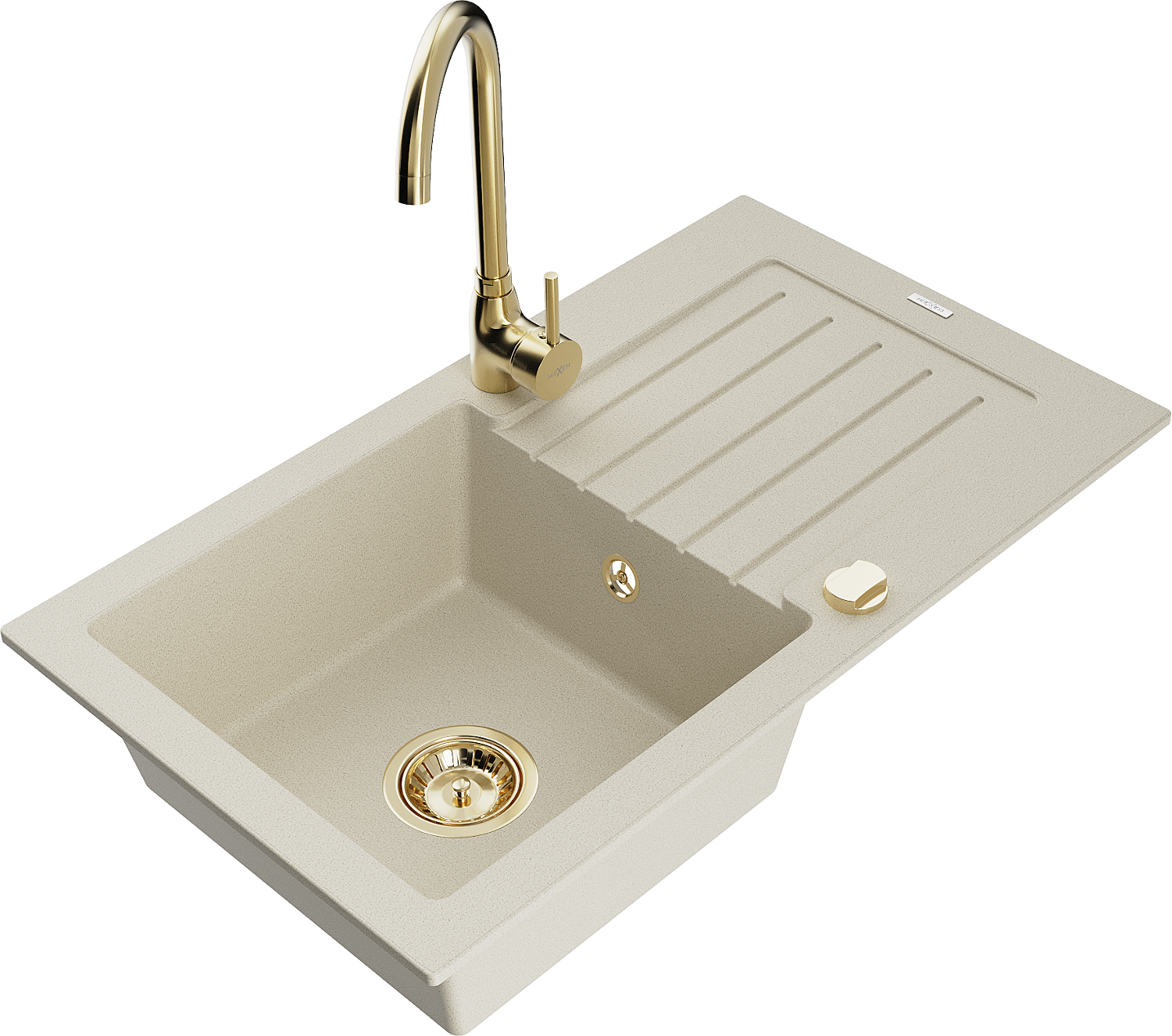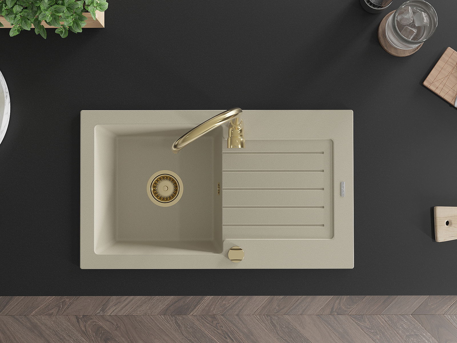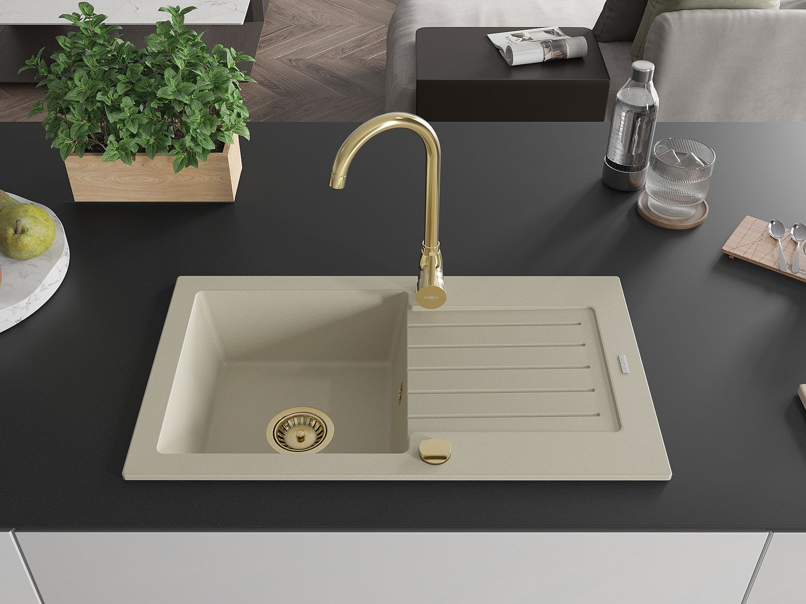 Mexen Pablo évier en granit 1 bac avec égouttoir et robinet de cuisine Telma, beige - 6510-69-670200-50