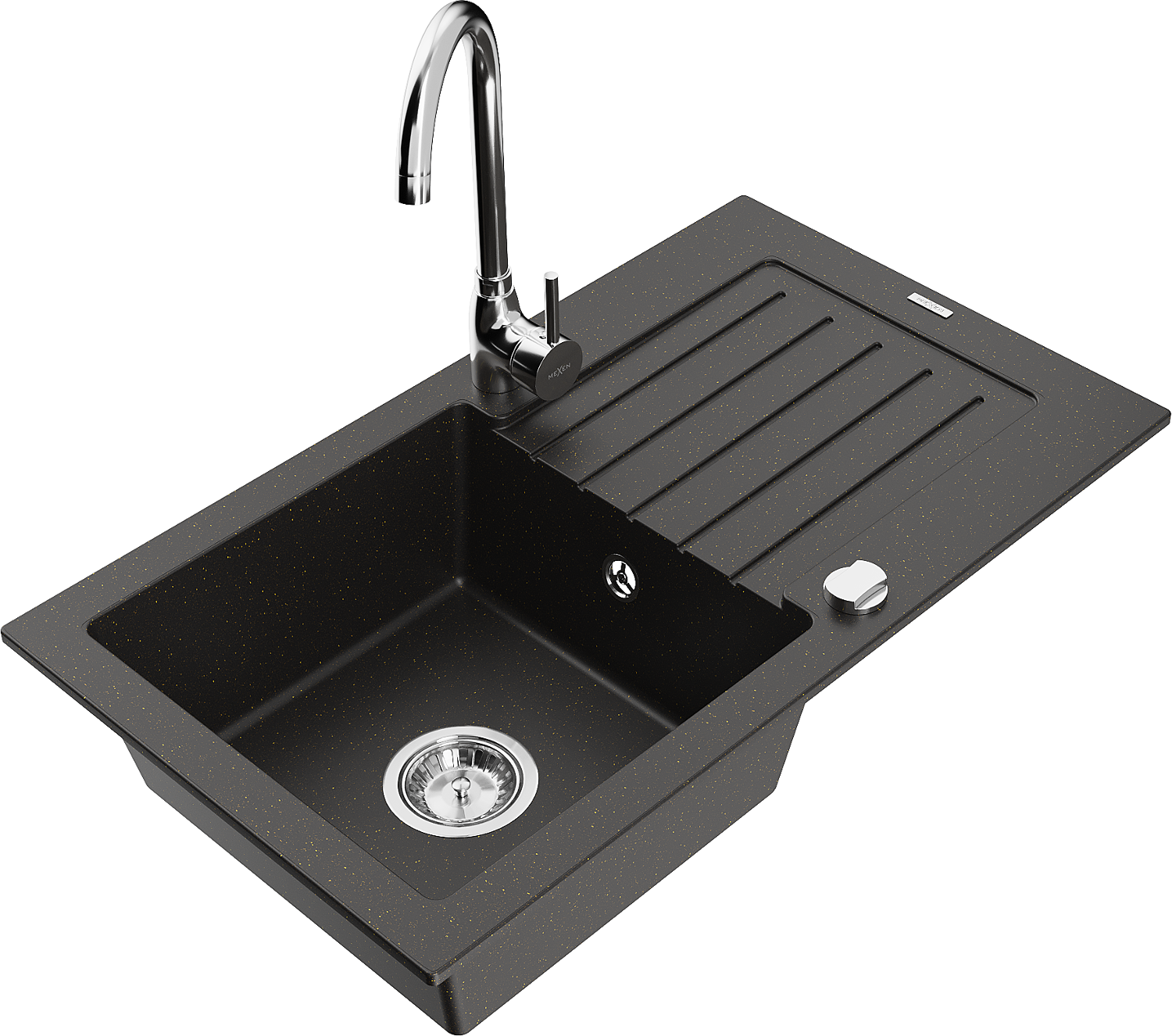 Mexen Pablo évier de cuisine en granit 1 bac avec égouttoir et robinet Telma, noir/or - 6510-75-670200-00