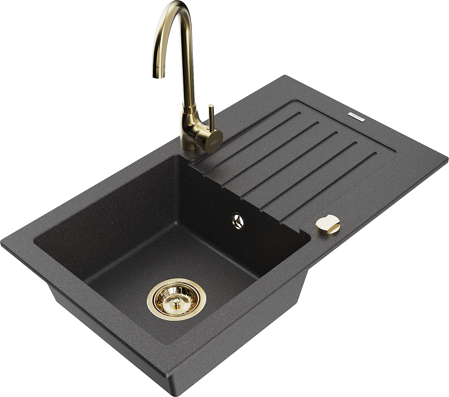 Mexen Pablo évier de cuisine en granit 1 bac avec égouttoir et robinet de cuisine Telma, noir moucheté - 6510-76-670200-50