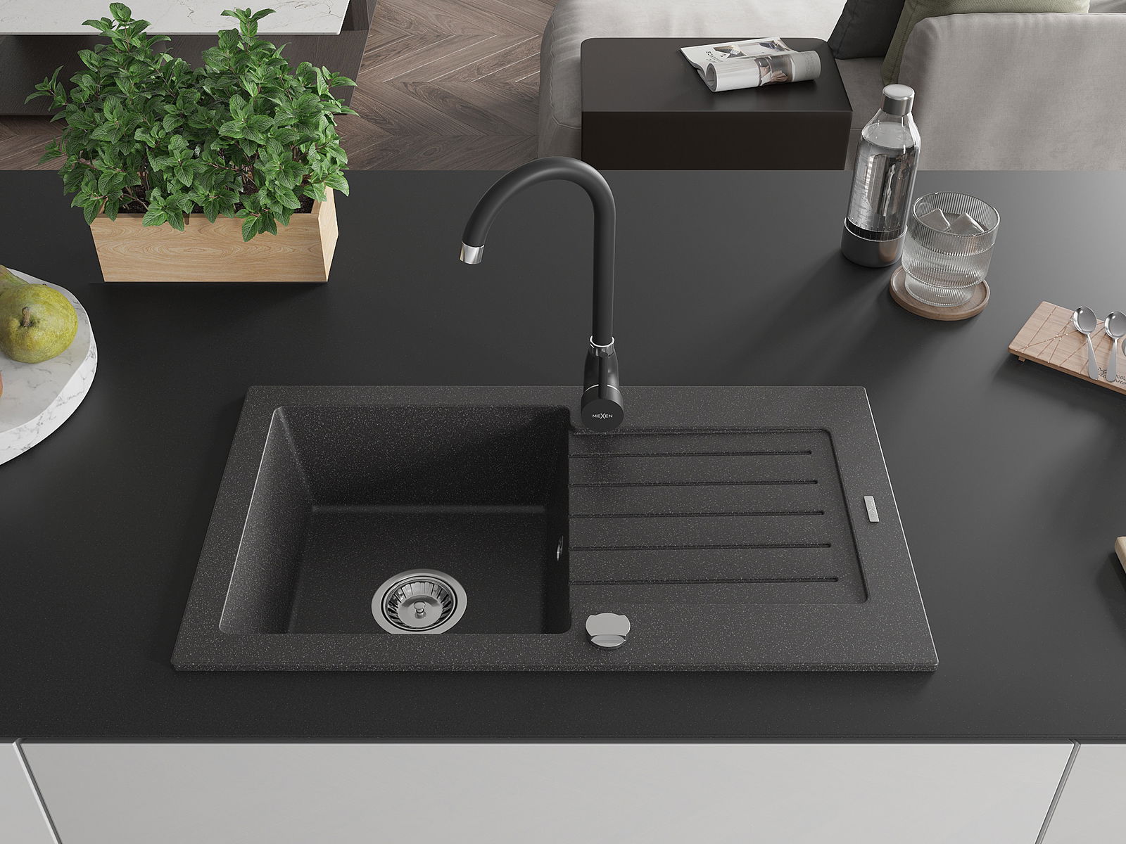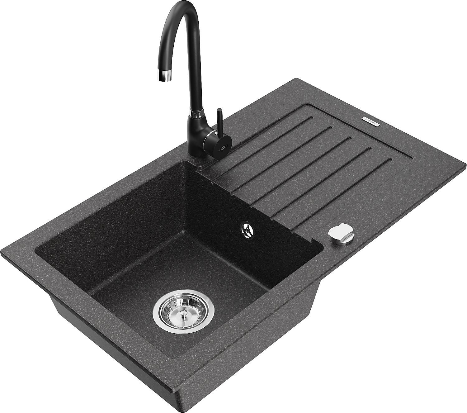 Mexen Pablo évier en granit 1 bac avec égouttoir et robinet de cuisine Telma, noir moucheté - 6510-76-670200-70