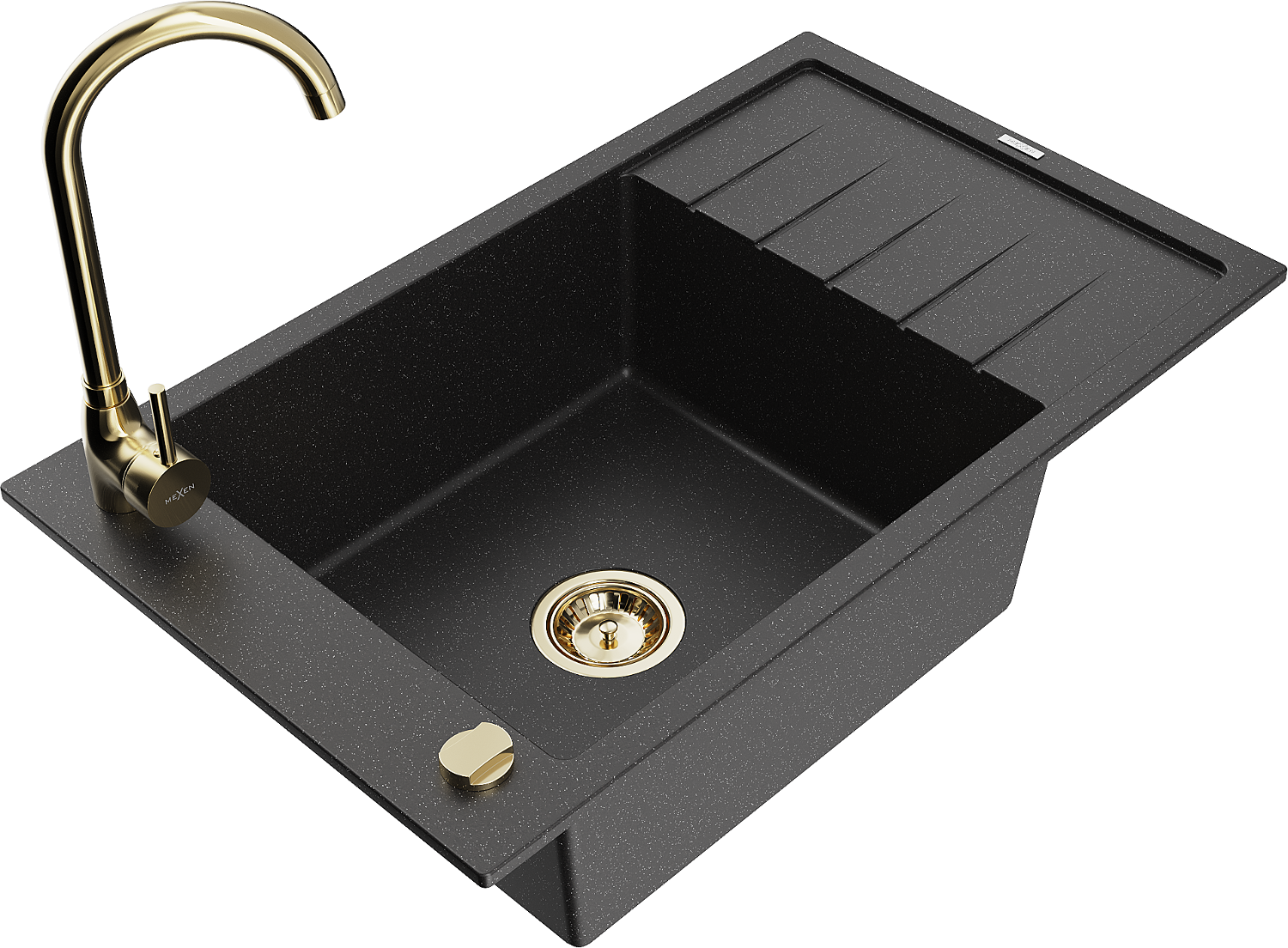 Mexen Elias évier en granit à 1 bac avec égouttoir et robinet de cuisine Telma, noir/argent - 6511-73-670200-50