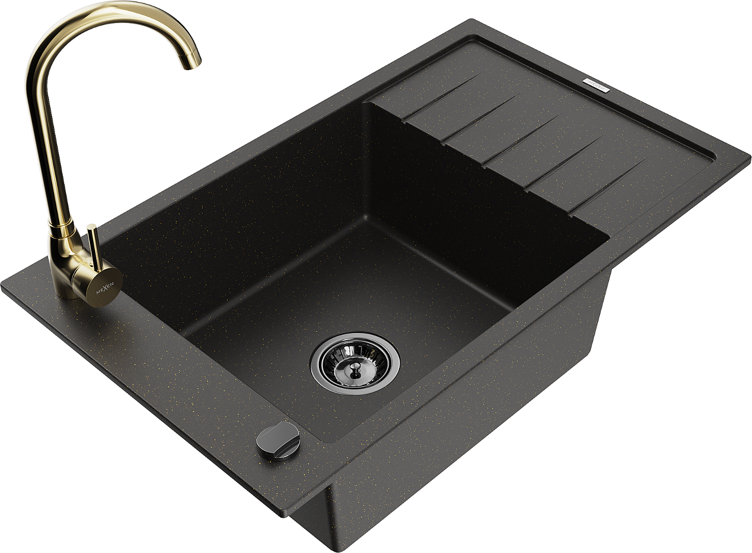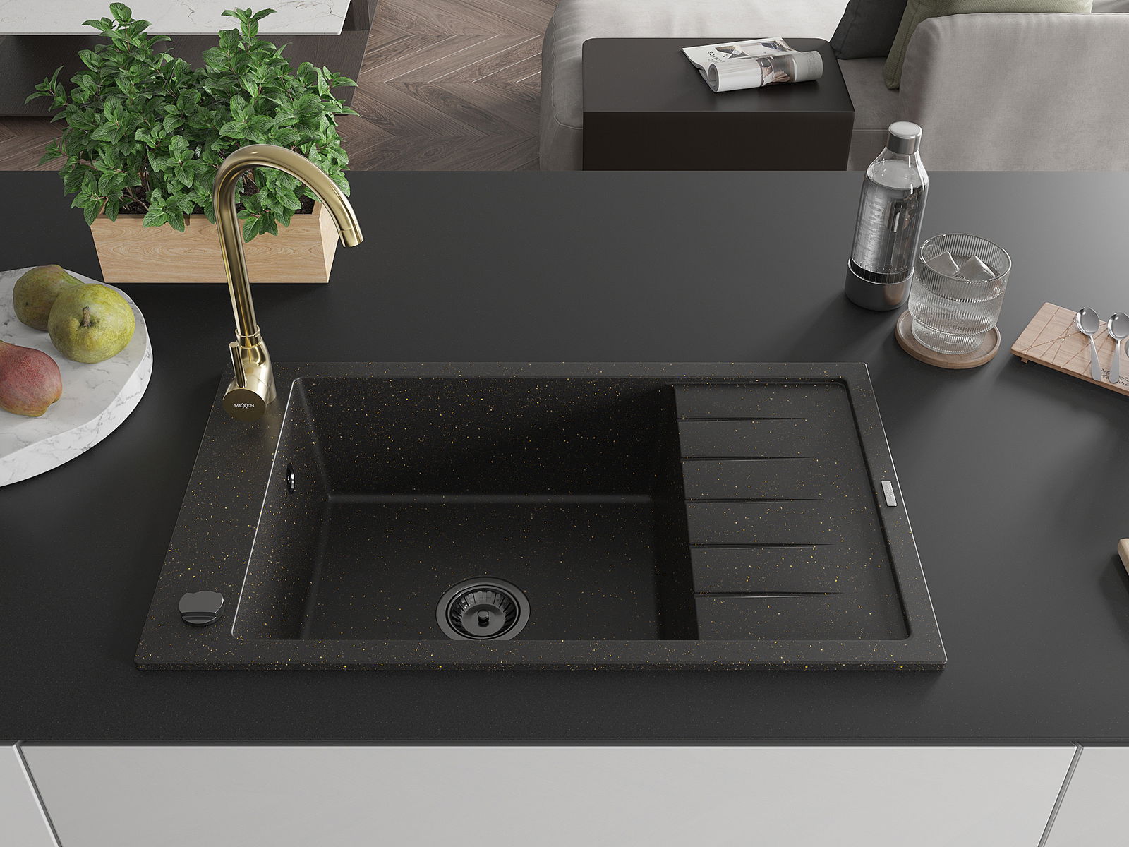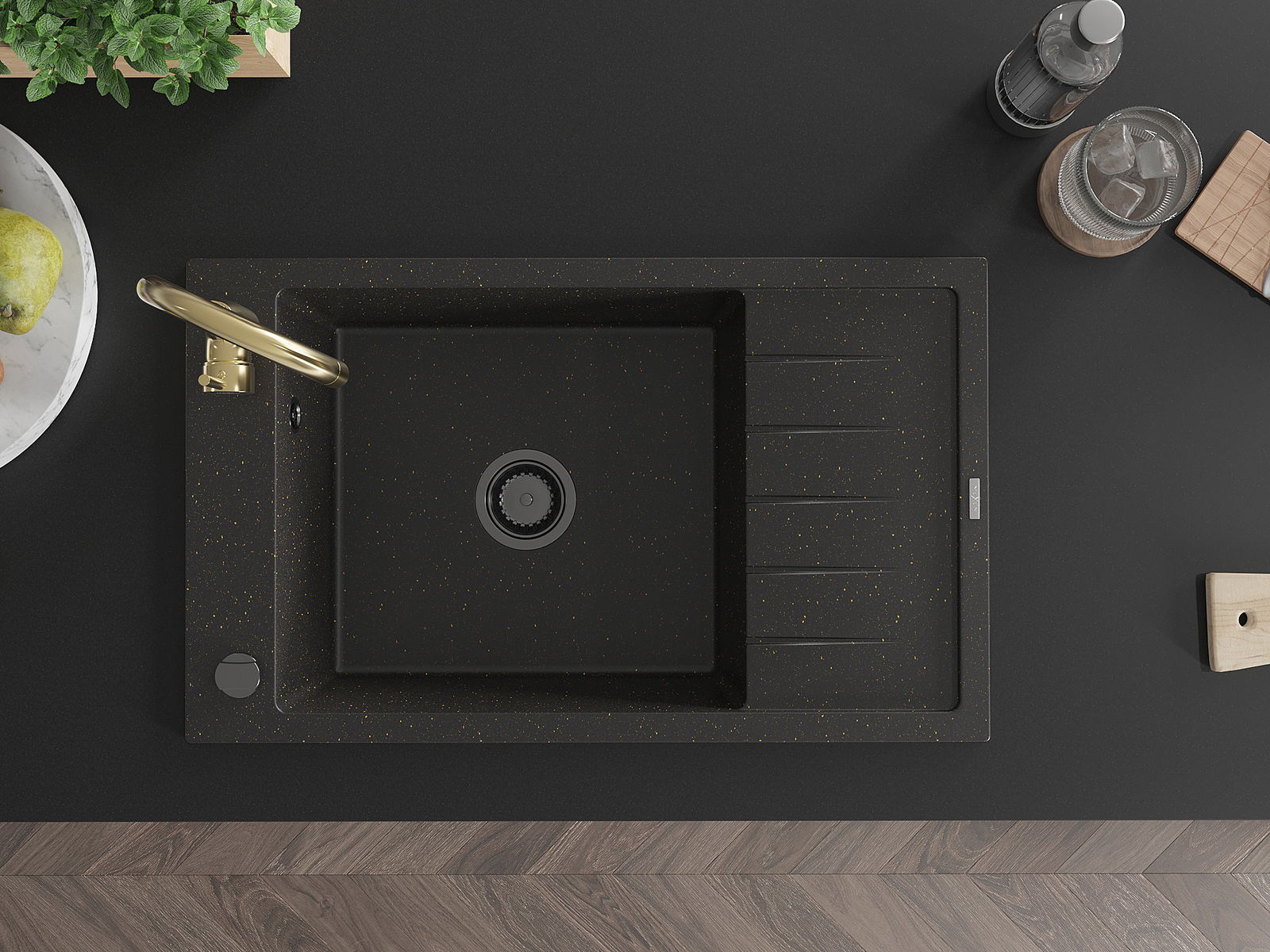 Mexen Elias évier de cuisine en granit 1 bac avec égouttoir et robinet de cuisine Telma, noir/doré - 6511-75-670200-50-B