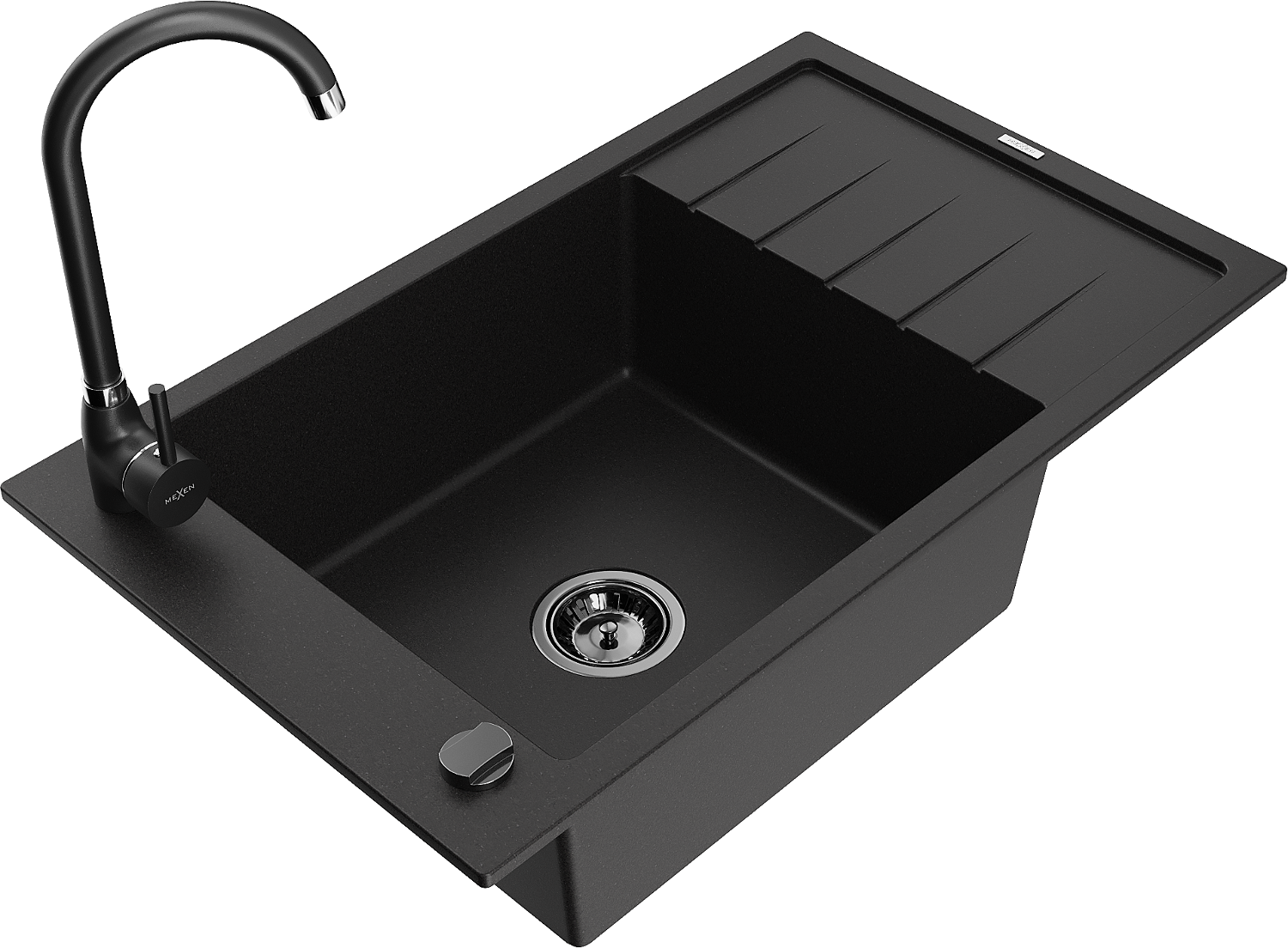 Mexen Elias évier en granit 1 bac avec égouttoir et robinet de cuisine Telma, noir - 6511-77-670200-70-B