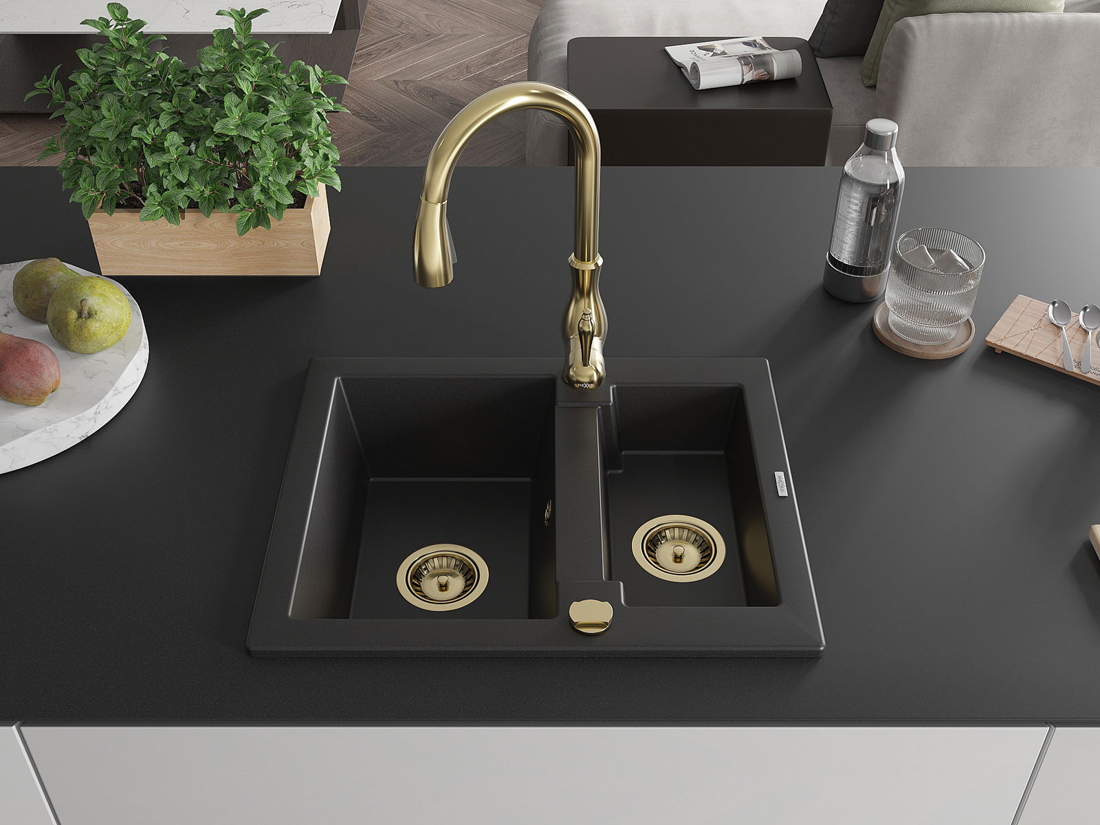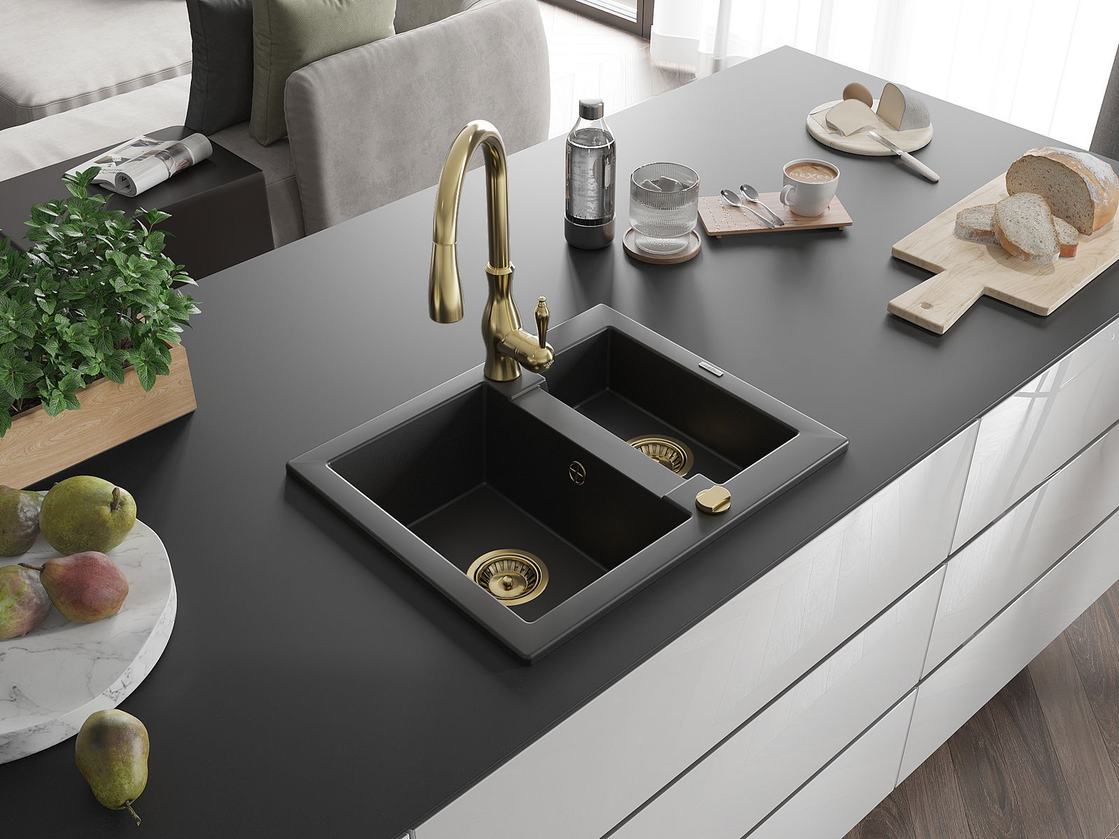 Mexen Carlos évier en granit 1,5 bac avec robinet de cuisine Savita, noir - 6518-77-672601-50