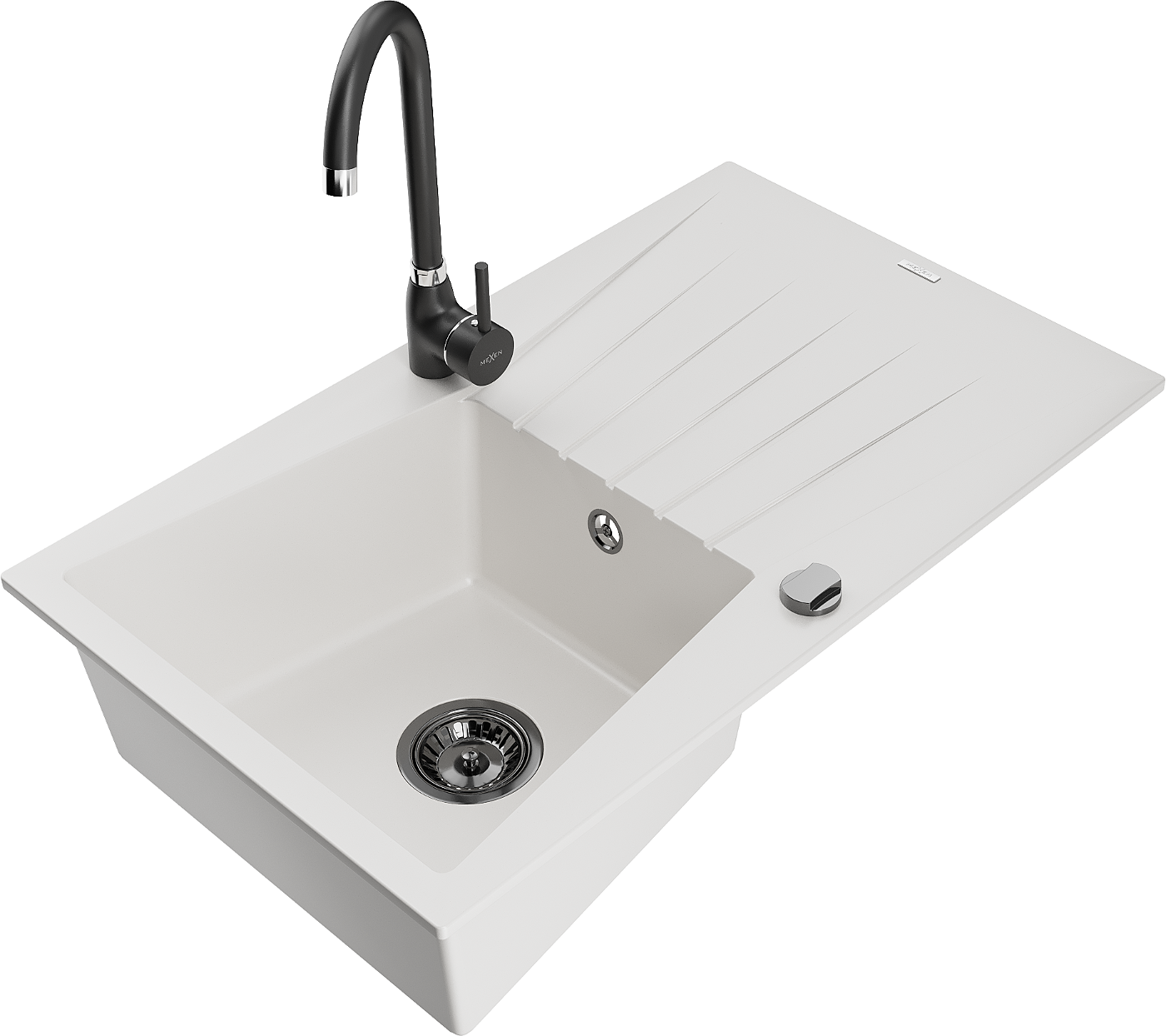 Mexen Cesar évier en granit 1 cuve avec égouttoir et robinet de cuisine Telma, blanc - 6514-20-670200-70