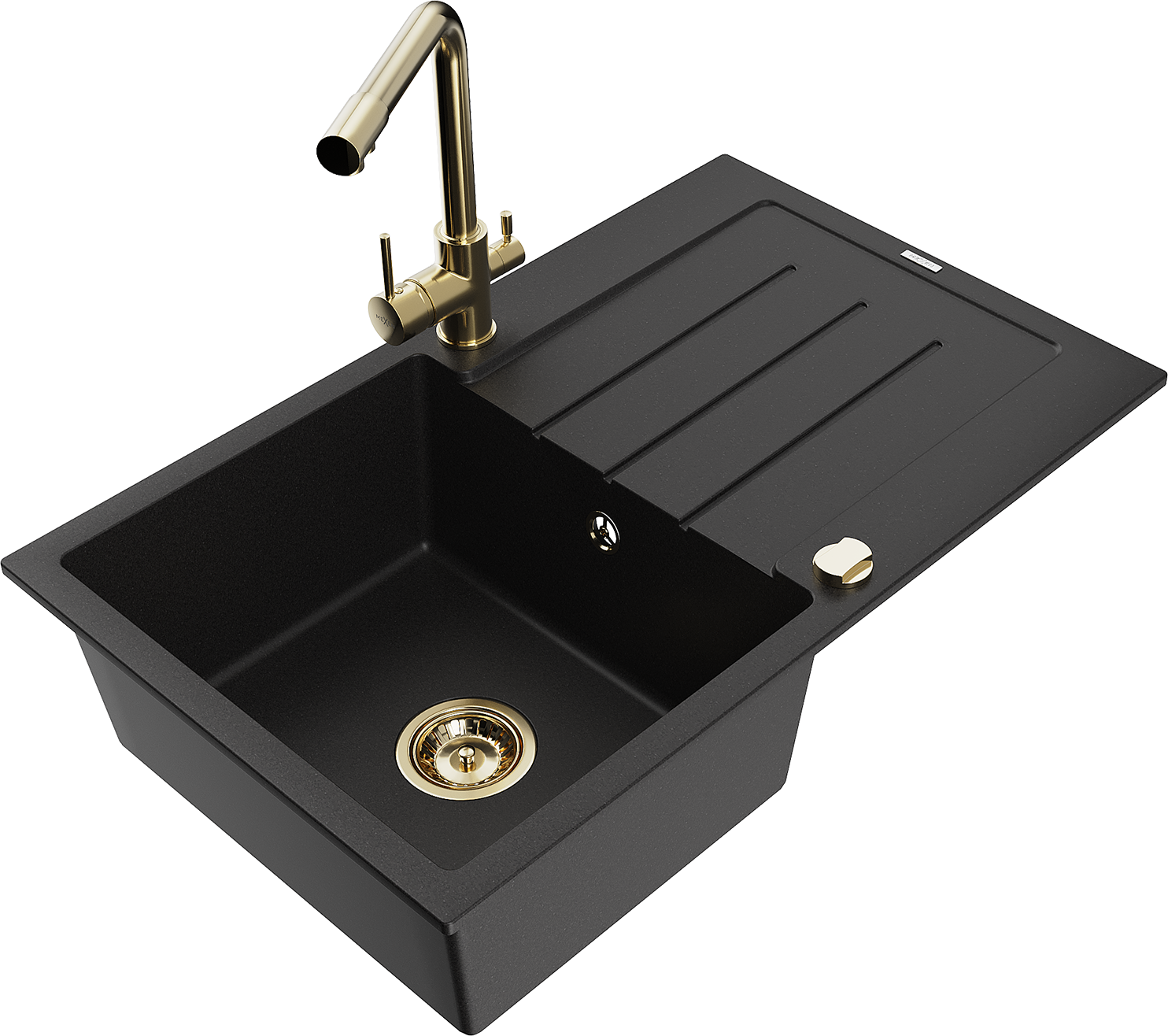 Mexen Bruno évier en granit 1 bac avec égouttoir et robinet de cuisine Duero, noir - 6513-77-671600-50