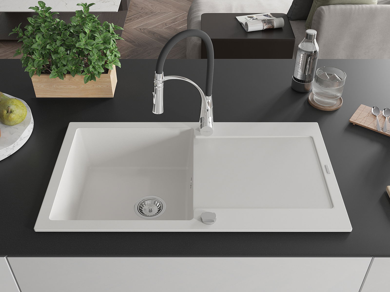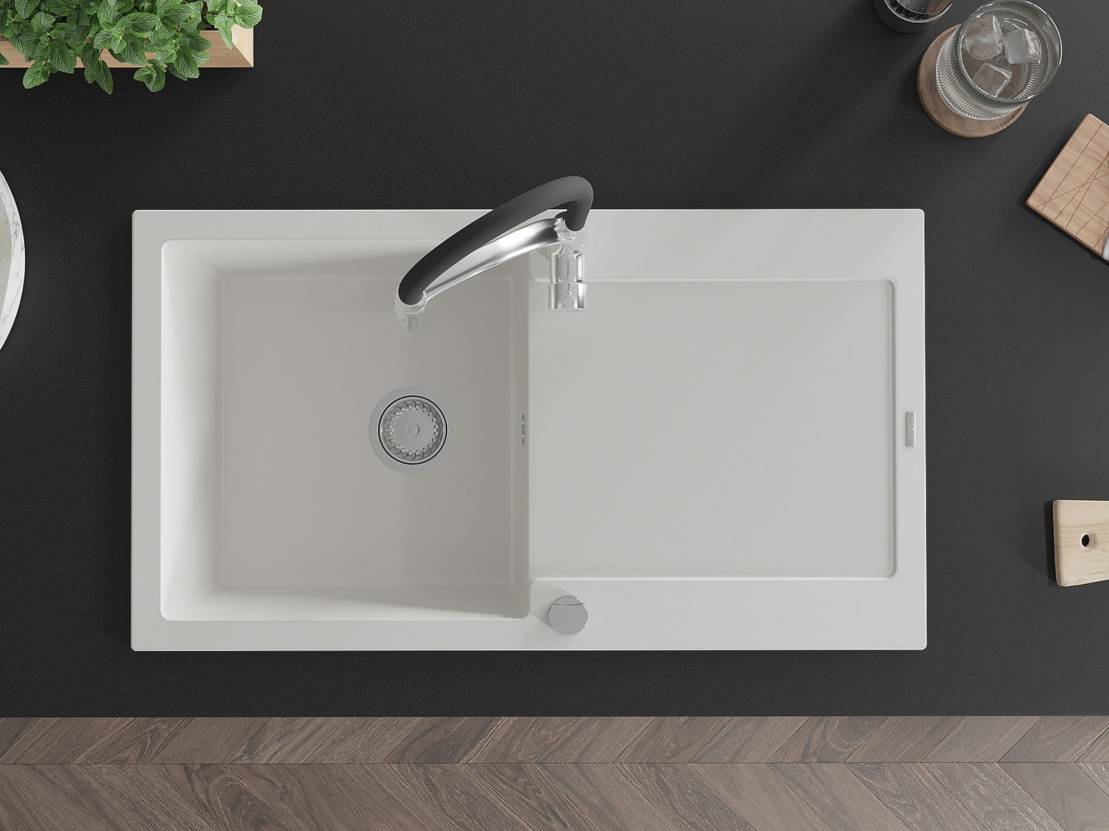 Mexen Leo évier de cuisine en granit 1 bac avec égouttoir et robinet de cuisine Aster, blanc - 6501-20-73450-07