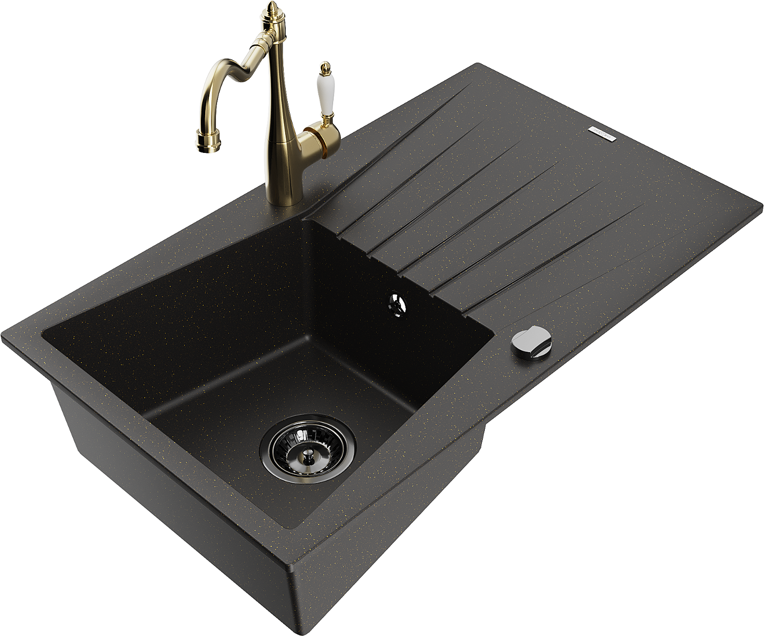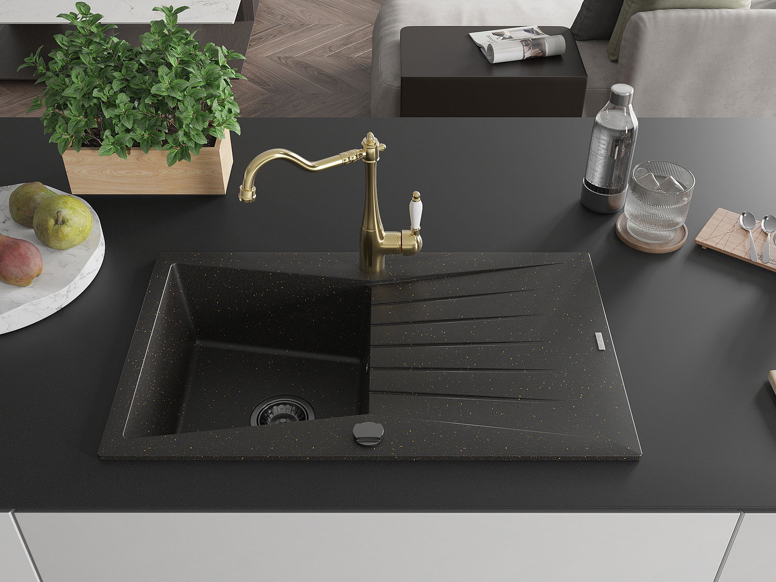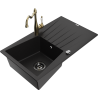 Mexen Cesar évier en granit 1 bac avec égouttoir et robinet de cuisine Carla, noir/or métallique - 6514-75-670700-50-B