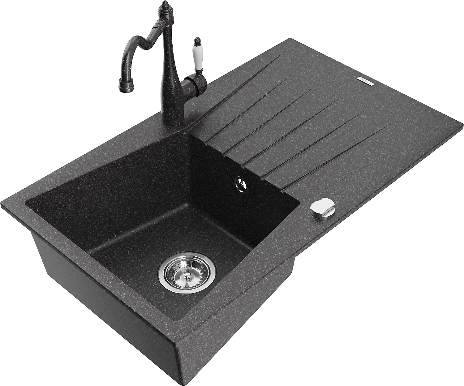 Mexen Cesar évier de cuisine en granit à 1 bac avec égouttoir et mitigeur Carla, noir moucheté - 6514-76-670700-76