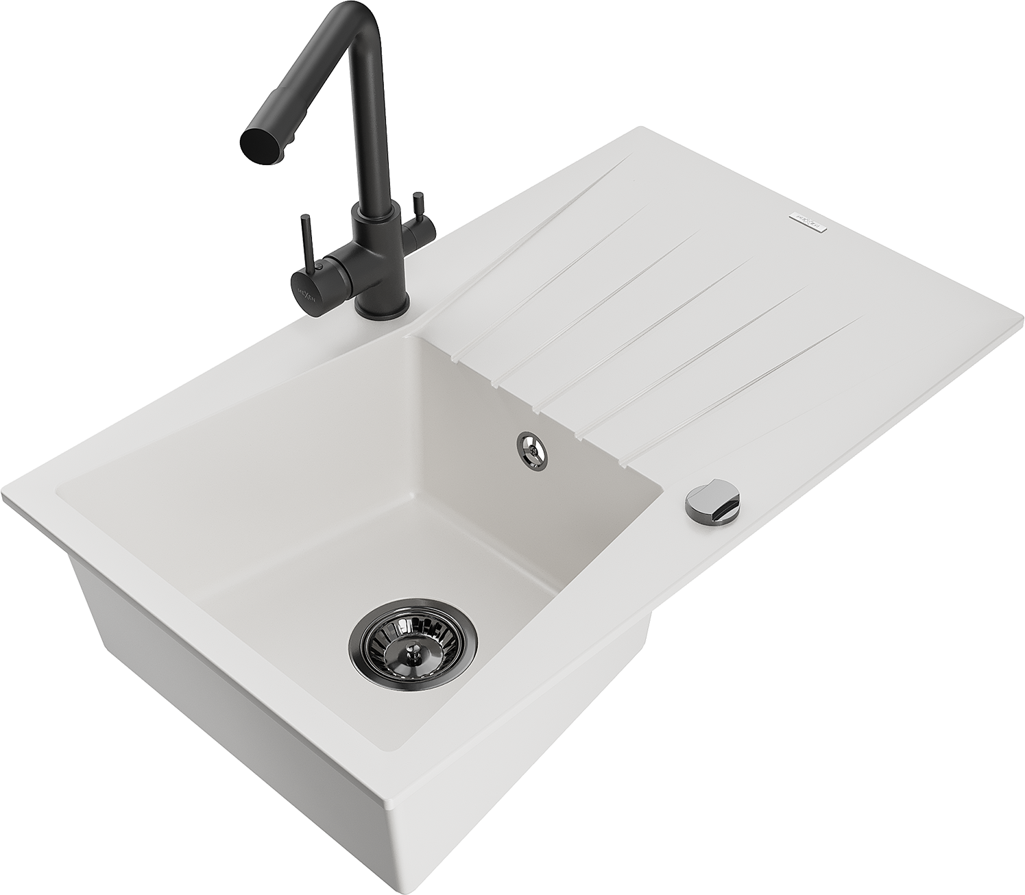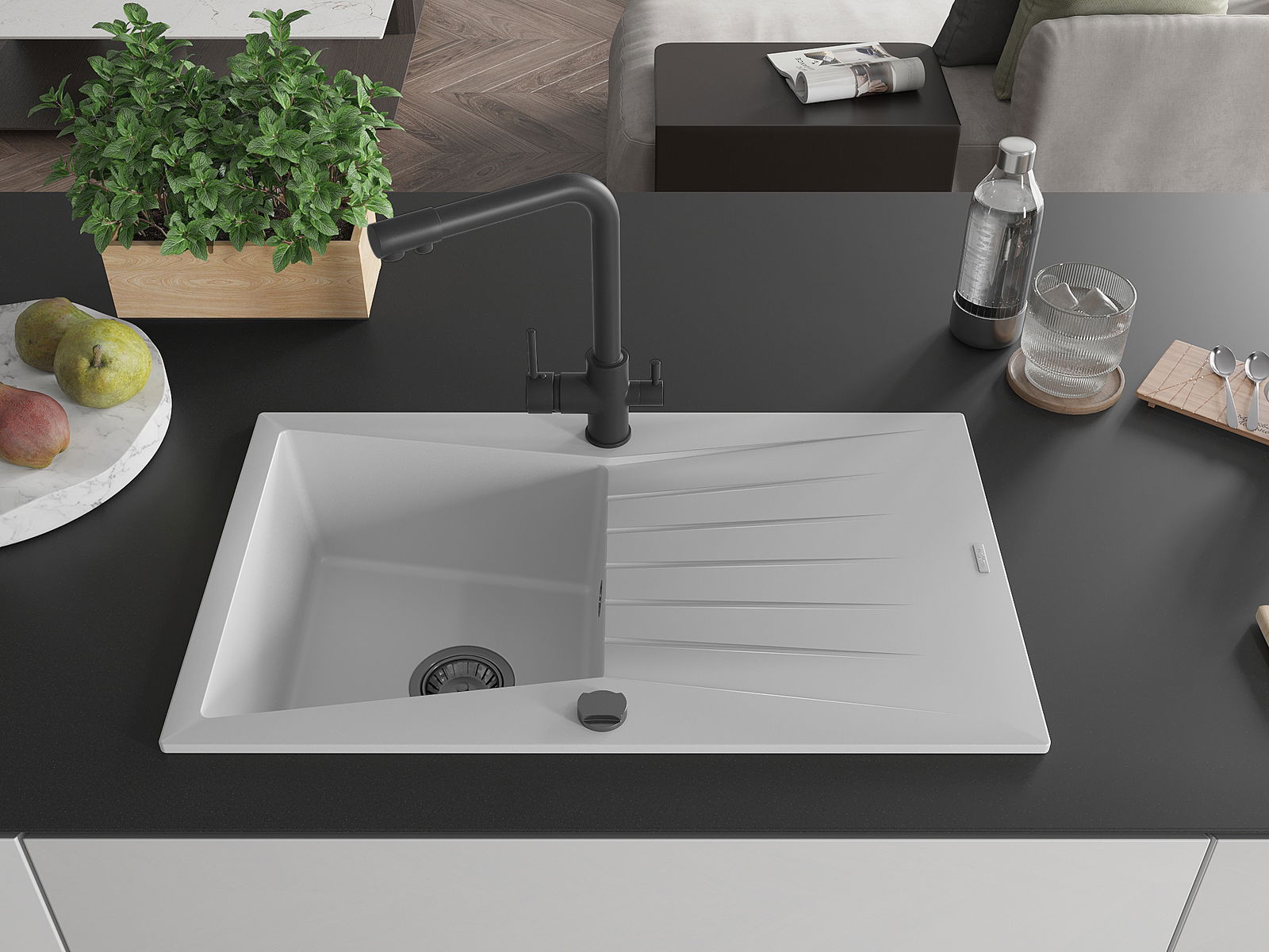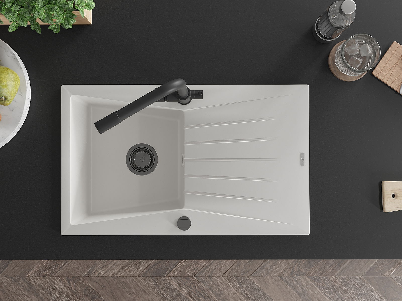 Mexen Cesar évier en granit 1 bac avec égouttoir et mitigeur de cuisine Duero, blanc - 6514-20-671600-70