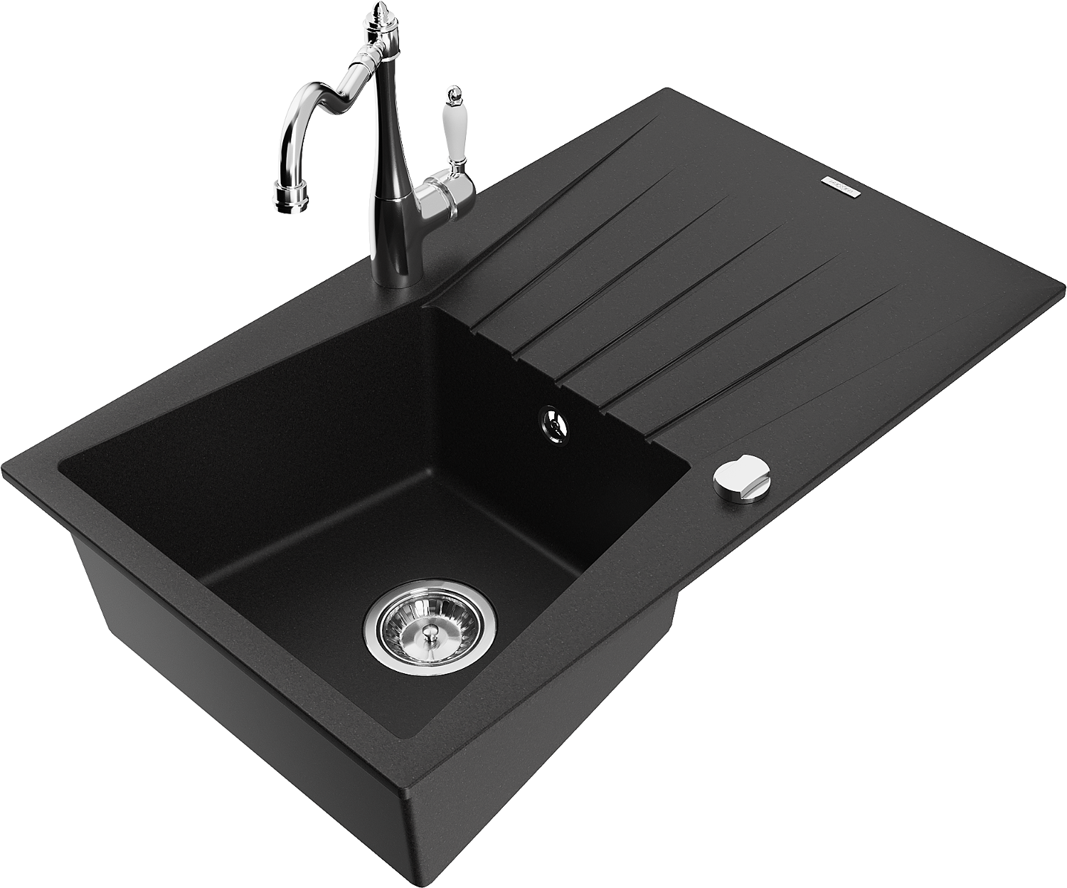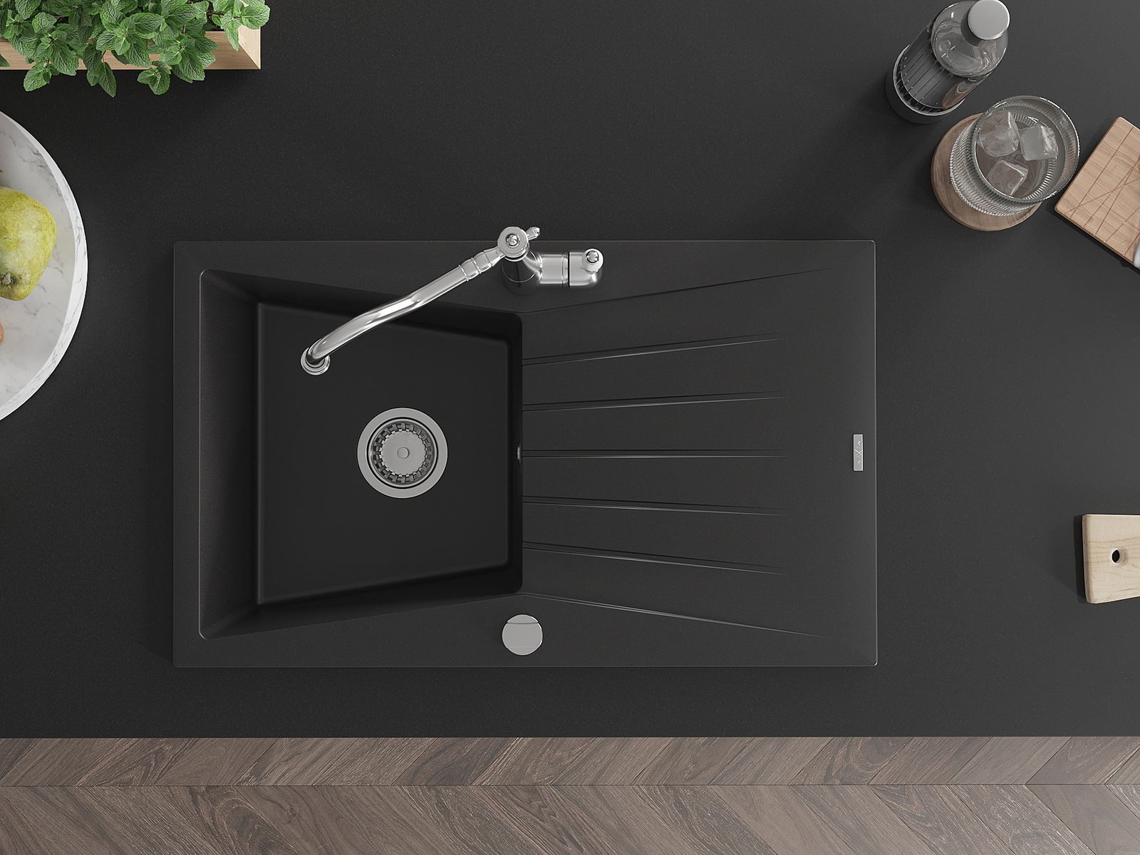 Mexen Cesar évier de cuisine en granit 1 bac avec égouttoir et robinet de cuisine Carla, noir - 6514-77-670700-00