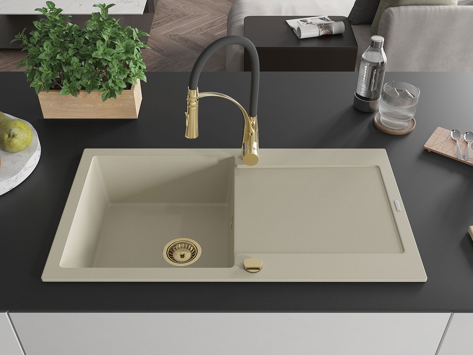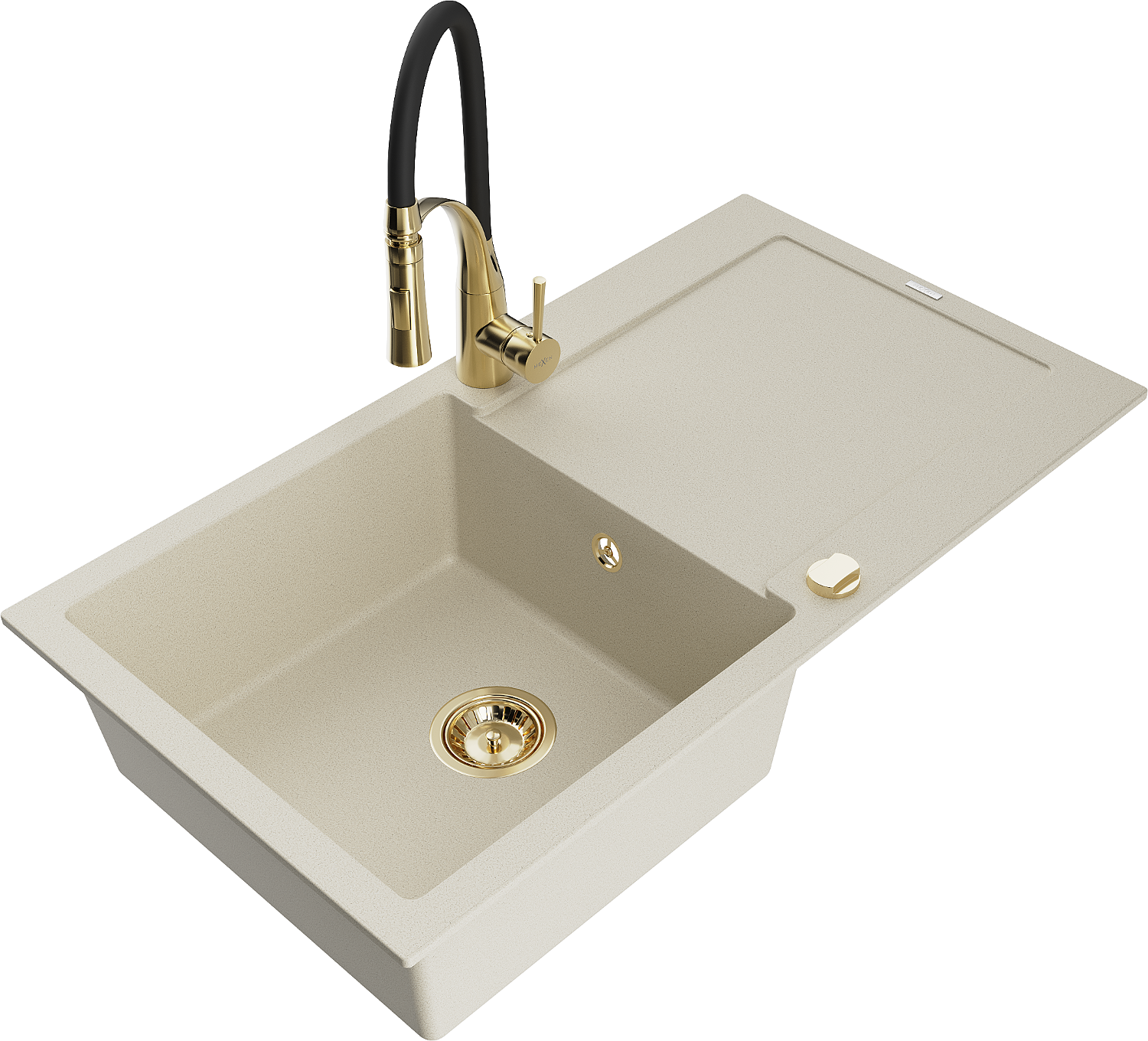 Mexen Leo évier en granit 1 bac avec égouttoir et robinet de cuisine Aster, beige - 6501-69-73450-57-G